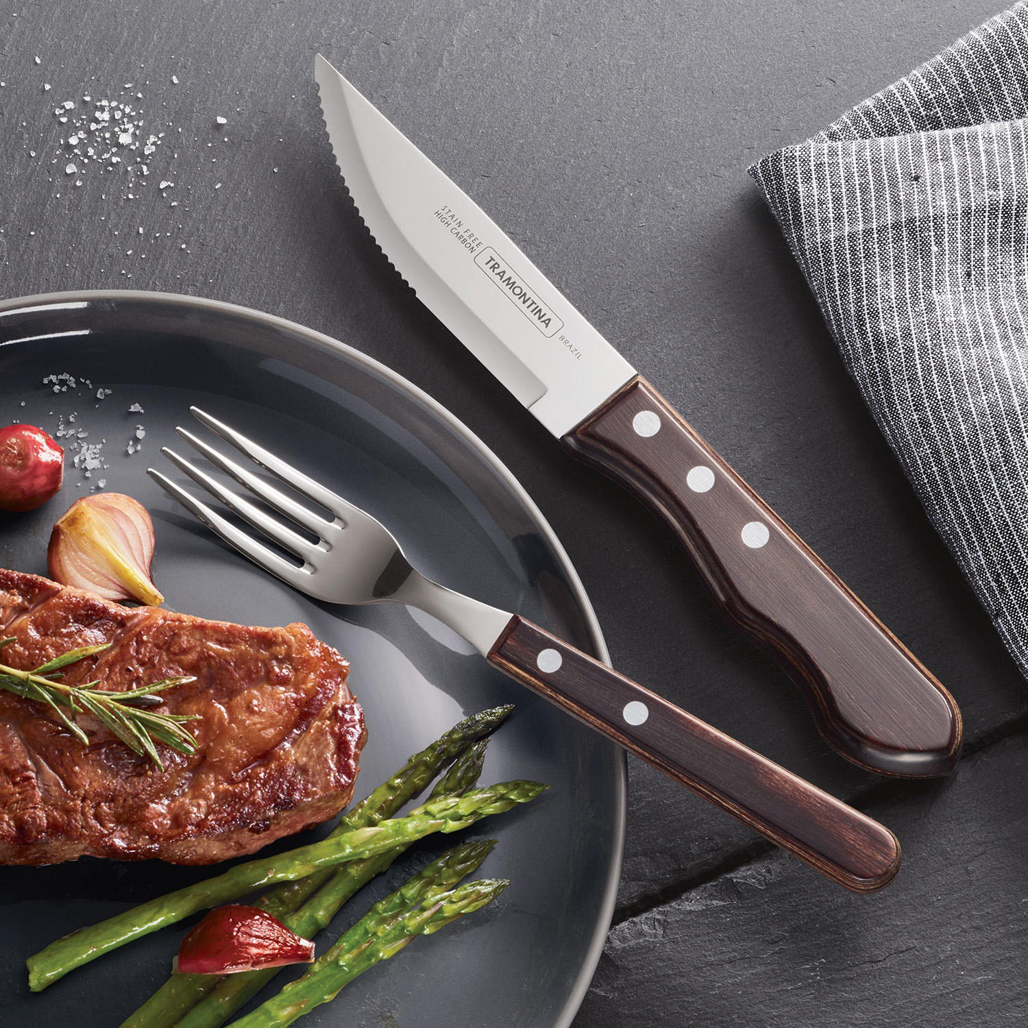 This steak knife and fork set is an ideal addition to the kitchen of just about any serious steak lover. It's designed to make it easy to cut through thick pieces of meat, such as steak. This carving knife and fork set is made from high-carbon, stain-free steel. The knives are made with serrated edges for a high-quality slice of meat at home. Each piece in the set is made with Polywood handles, which give them a comfortable grip. The benefit of Polywood is that it has better durability and exhibits more resistance to water as compared to traditional wood. This also helps makes it easy to clean the Tramontina set, which is safe to use in a dishwasher.