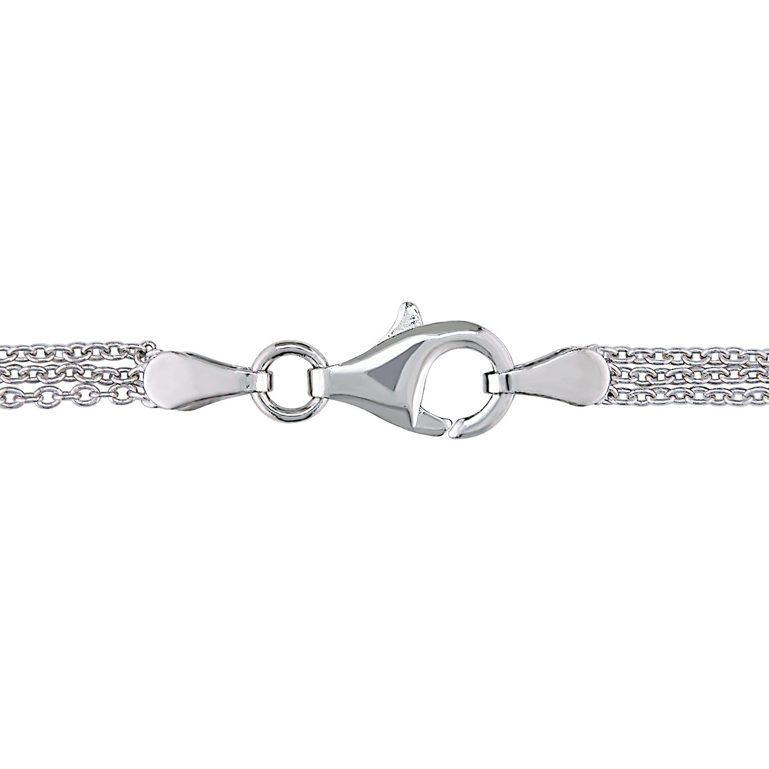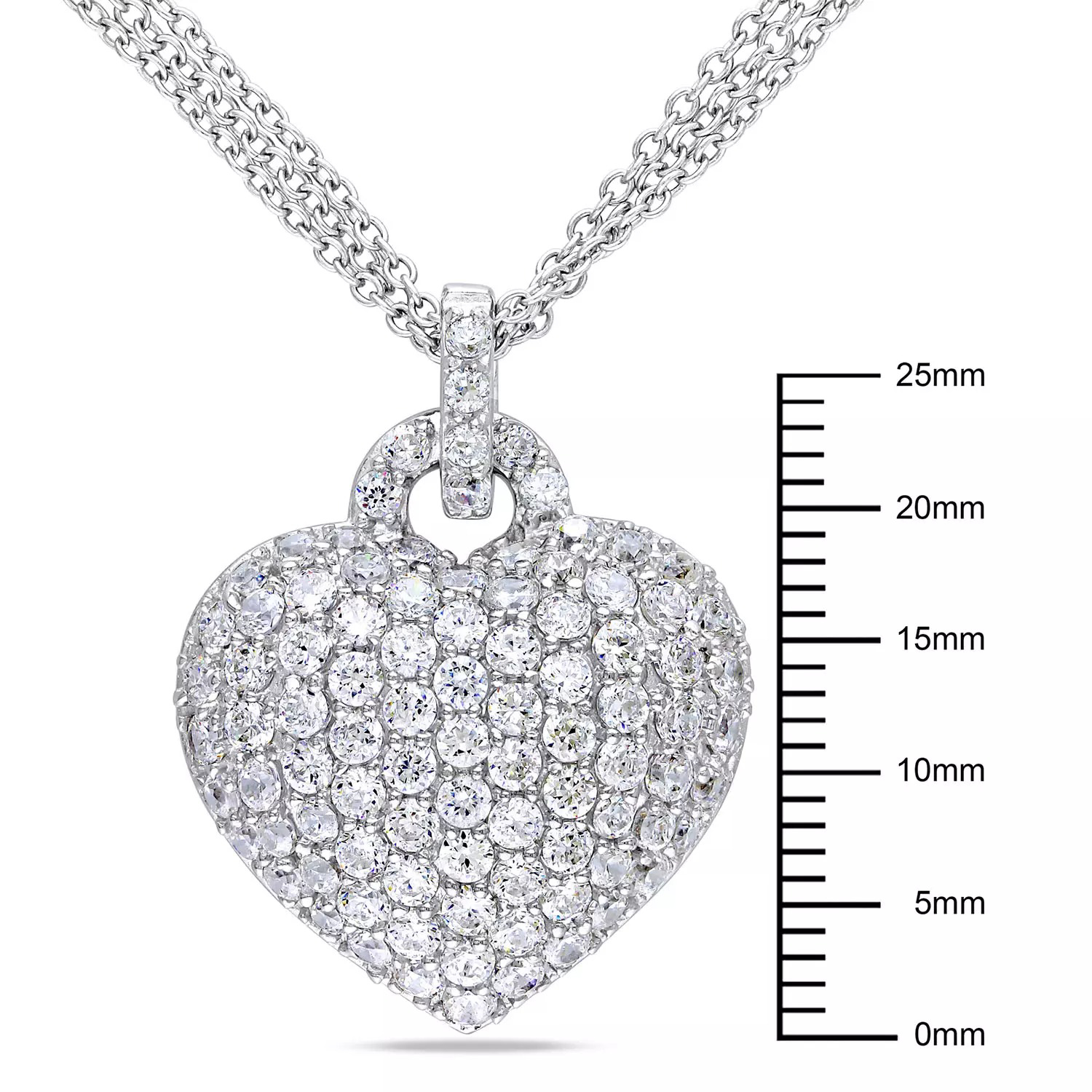Turn heads with this gorgeous created white sapphire heart pendant. Crafted in lustrous sterling silver and adorned with sparkling created white sapphire gemstones, the pendant is suspended on a 17 inches 3-strand round cable chain and comfortably secured with a lobster clasp. Polished to a brilliant shine, this classy design pendant will be a beautiful addition to any jewelry collection.