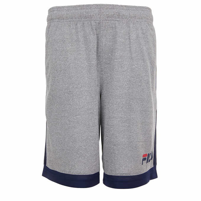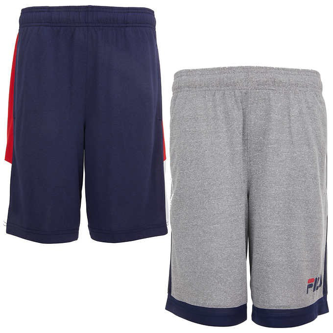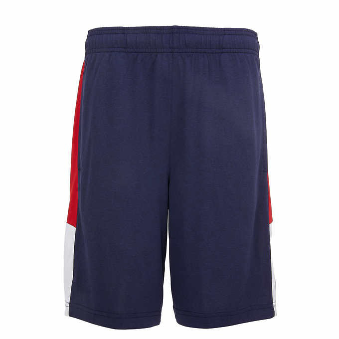 Color(s): navy and gray. Set includes 2 pairs of shorts. Navy short with red mesh/white inset and brand logo on the side. Gray short with navy stripes on the sides/hem and brand logo at bottom left leg. Internal draw cords. Side seam pockets. Made in China.