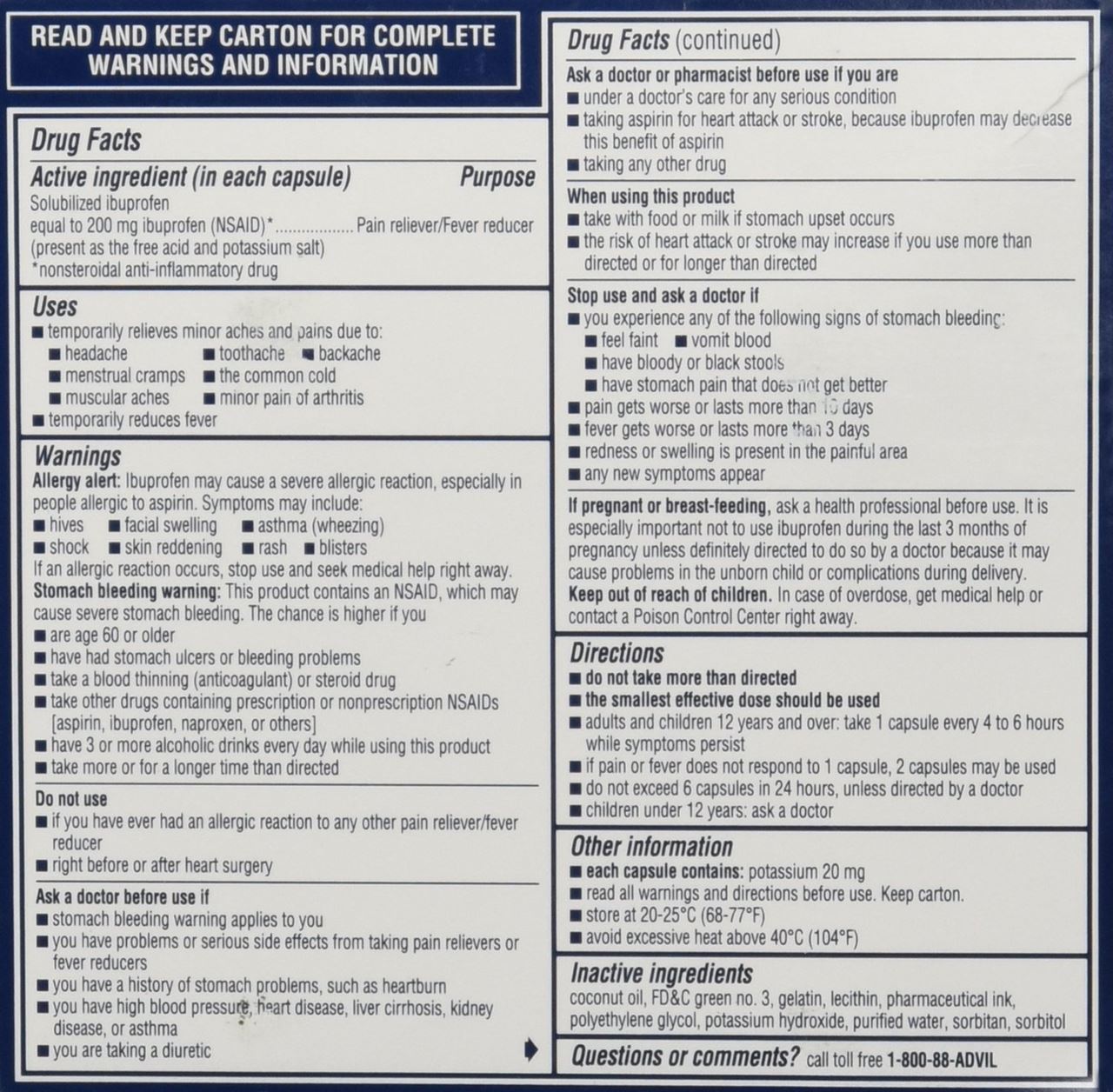 When pain strikes, there is no time to wait for relief. Get fast pain relief at liquid speed with Advil Liqui-Gels. Advil Liqui-Gels provide fast relief from headaches, muscle aches, minor arthritis and other joint pain. Advil Liqui-Gels contain 200mg of ibuprofen and is an effective fever reducer. The quick-acting medicine in Advil is engineered to relieve pain at the site of inflammation. With pain out of the picture, you can get on with your day.The medicine in Advil is the #1 doctor-recommended treatment for effective pain relief (2) and the #1-selling pain reliever among over-the-counter medications (1). Be ready and face pain head-on by adding Advil Liqui-Gels to your shopping cart.(1) Based on OTC sales(2) Based on a survey of doctors