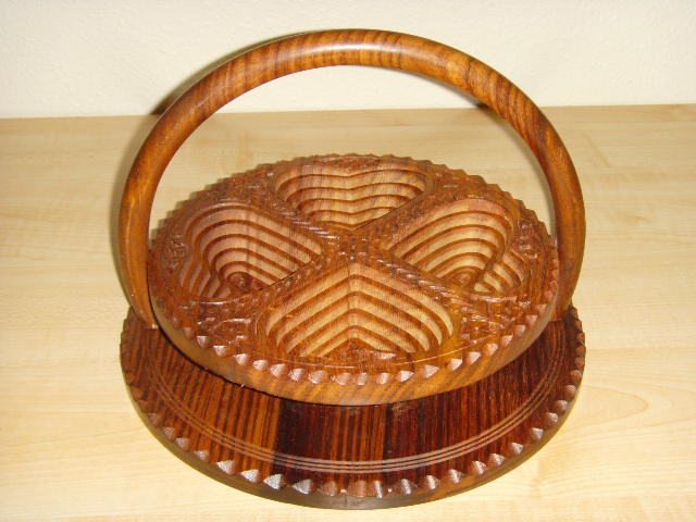 * It Size 10" Round and 4 Compartments.* It is made out of one piece of rosewood.* It is all hand made and handcraft.* It's a long time useable.* The collapsible Baskets Look beautiful.* Imported made in Pakistan.* It's no fear of breaking and rot.* Great For You Or A Gift* Perfect For The Collector!* It also makes a perfect gift for different occasions or for someone who has everything.* Once you lift the handle from one side, you can use it for fruits, candies, nuts, potpourri, jewelry, decorative piece.* Using a scroll saw, the artist starts cutting from the middle in a continuous cut, the same way you peel an orange.* It is a spiral cut on a 5 to 7-degree an angle, and that is how one layer locks on top of the other.* You can see it clearly on the fruit shape as well but because of the angle, try not to flip it upside down unless you put your hand underneath.* All Hand Carved Collapsible Baskets Are First Class. No Irregulars!* This is an Angel licensed an exclusive item that cannot be found anywhere else.