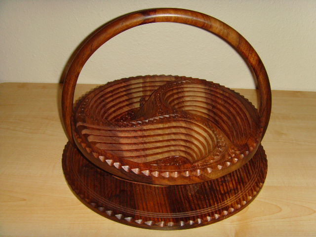 * It Size 12" Round and 3 Compartments.* It is made out of one piece of rose wood.* It is all hand made and hand-carved.* It's a long time useable.* The collapsible Baskets Look beautiful.* Imported made in Bangladesh.* It's no fear of breaking and rot.* Great For You Or A Gift* Perfect For The Collector!* It also makes a perfect gift for different occasions or for someone who has everything.* Once you lift the handle from one side, you can use it for fruits, candies, nuts, potpourie, jewelry, decorative piece.* Using a scroll saw, the artist starts cutting from the middle in a continuous cut, the same way you peel an orange.* It is a spiral cut on a 5 to 7-degree an angle, and that is how one layer locks on top of the other.* You can see it clearly on the fruit shape as well but because of the angle, try not to flip it upside down unless you put your hand underneath.* All Hand Carved Collapsible Baskets Are First Class. No Irregulars!* This is an Angel licensed Exclusive item that cannot be found anywhere else.