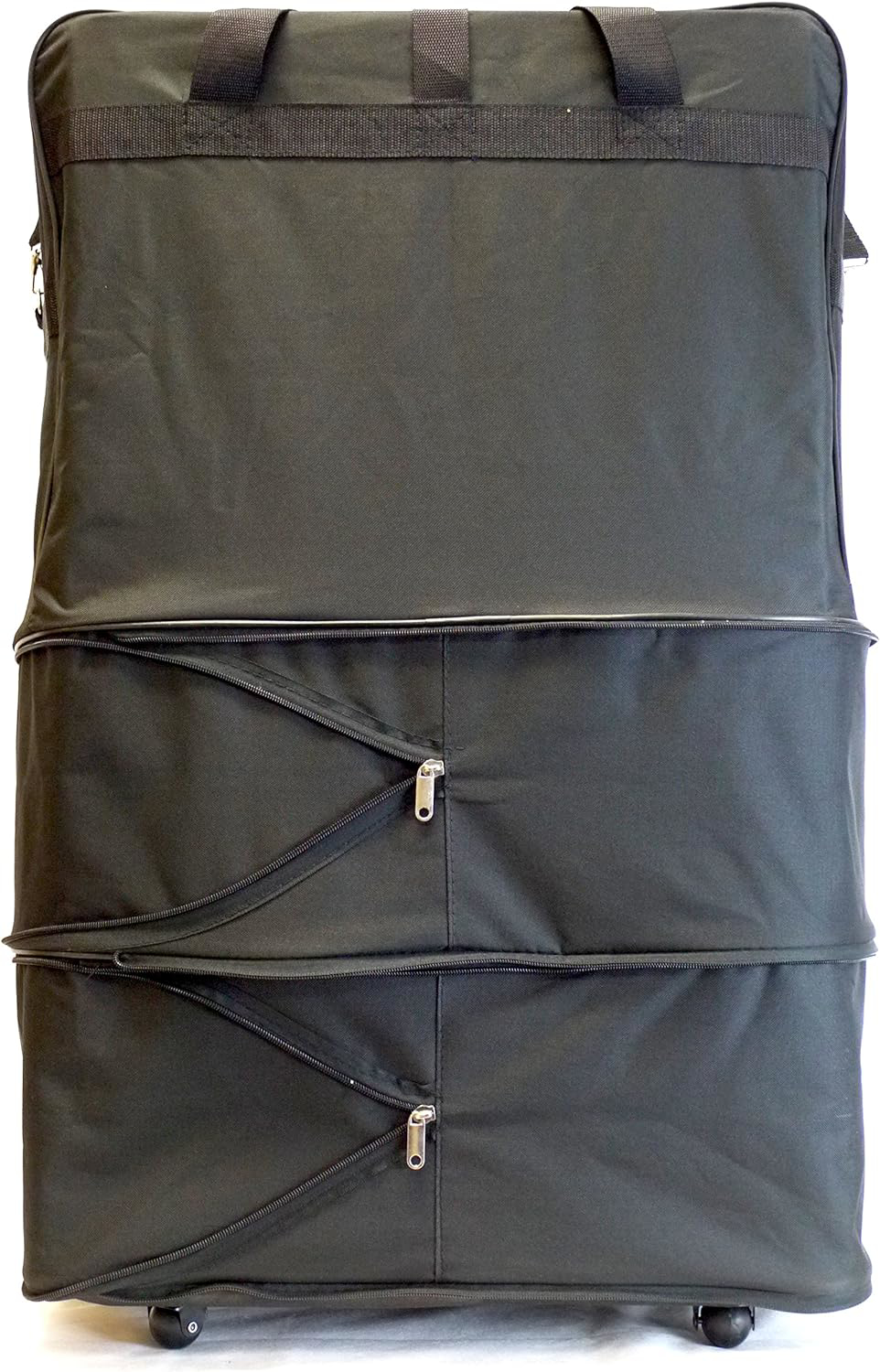 Has 6 wheels on the bottom for 360 movement. 2 expansion zippers to adjust as needed. Max height is 40" when fully expanded.