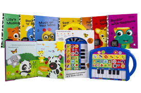 Get ready to make some music with your Baby Einstein friends! Eight rhyming storybooks introduce toddlers to different music themes and include easy-to-follow sheet music and lyrics for 25 songs. Pick a song–from childhood favorites to classical selections–and play along! The keyboard is color-coded for easy learning. Add to the fun by putting your own spin on the music–choose from 6 instruments, 4 rhythms, 11 tempos, and 4 sound effects!