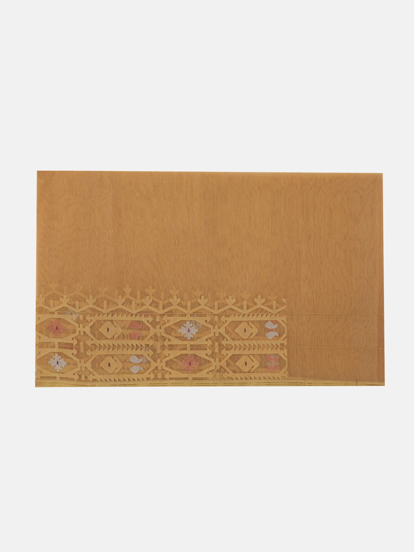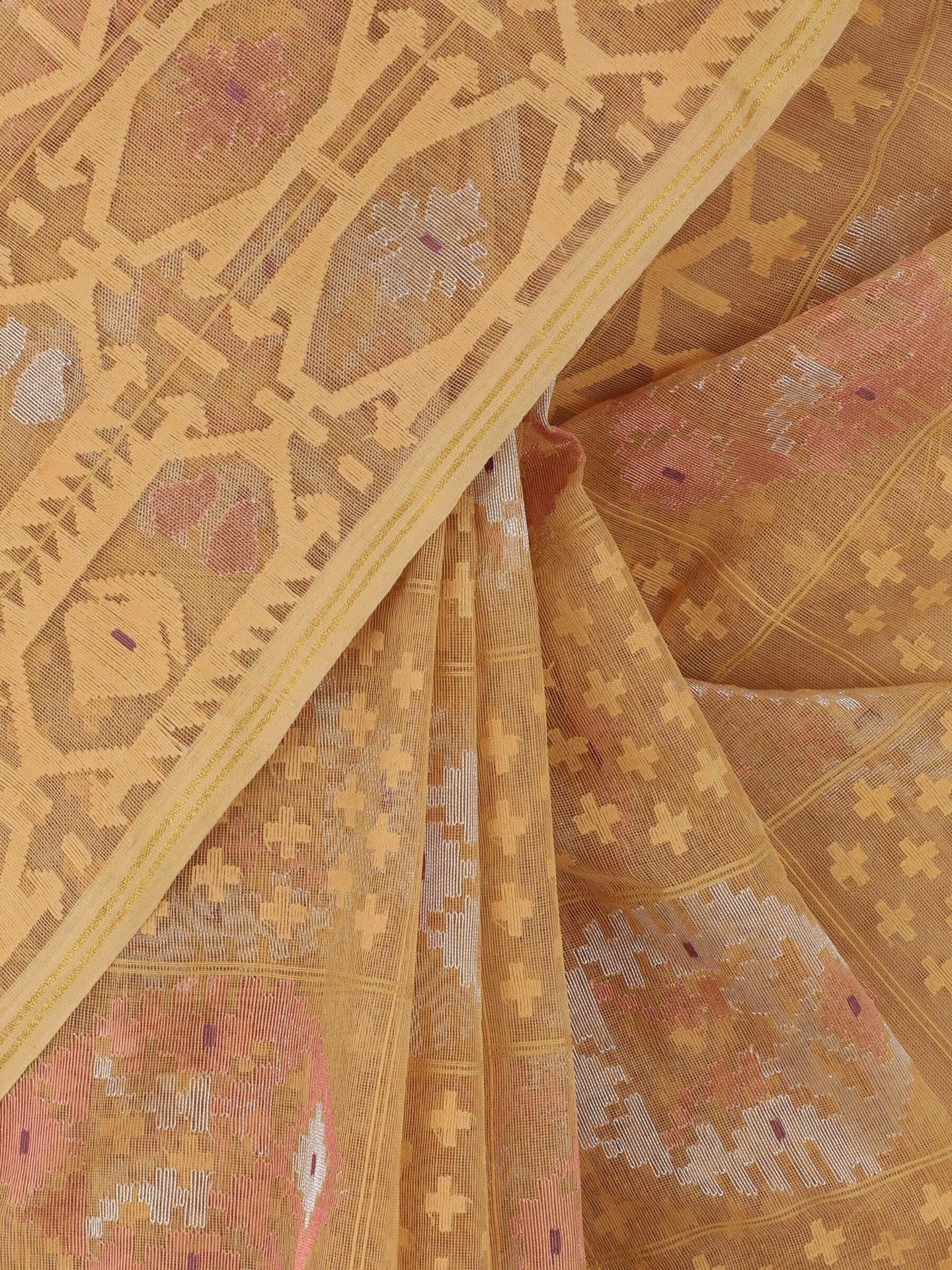 Beige half silk jamdani saree with silver, copper and purple buti. Comes with unstitched blouse piece.