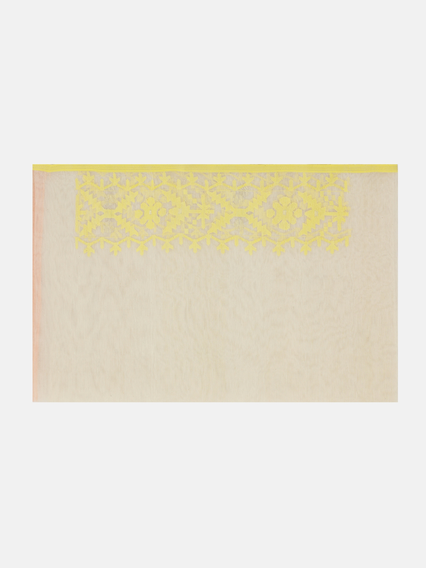 Beige half silk jamdani saree with golden, yellow and white buti. Comes with matching separate unstitched blouse piece.