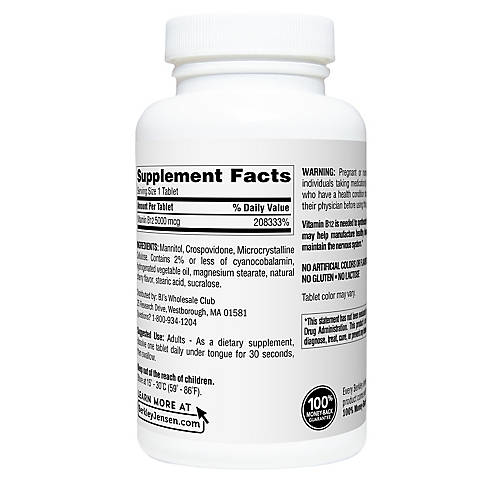 Berkley Jensen's Quick Dissolve Dietary Supplement may help support energy metabolism and nervous system health. Vitamin B12 is needed to synthesize hemoglobin, may help manufacture healthy blood cells, and helps maintain a healthy nervous system*. These tablets come in a natural cherry flavor, making them both easy and delicious on the go! To use, simply dissolve one tablet daily under your tongue for 30 seconds, then swallow. This product contains no artificial colors or flavors, is gluten-free, and also lactose-free. Get the daily energy you need! *These statements have not been evaluated by the Food and Drug Administration. This product is not intended to diagnose, treat, cure, or prevent any disease.Product Features: