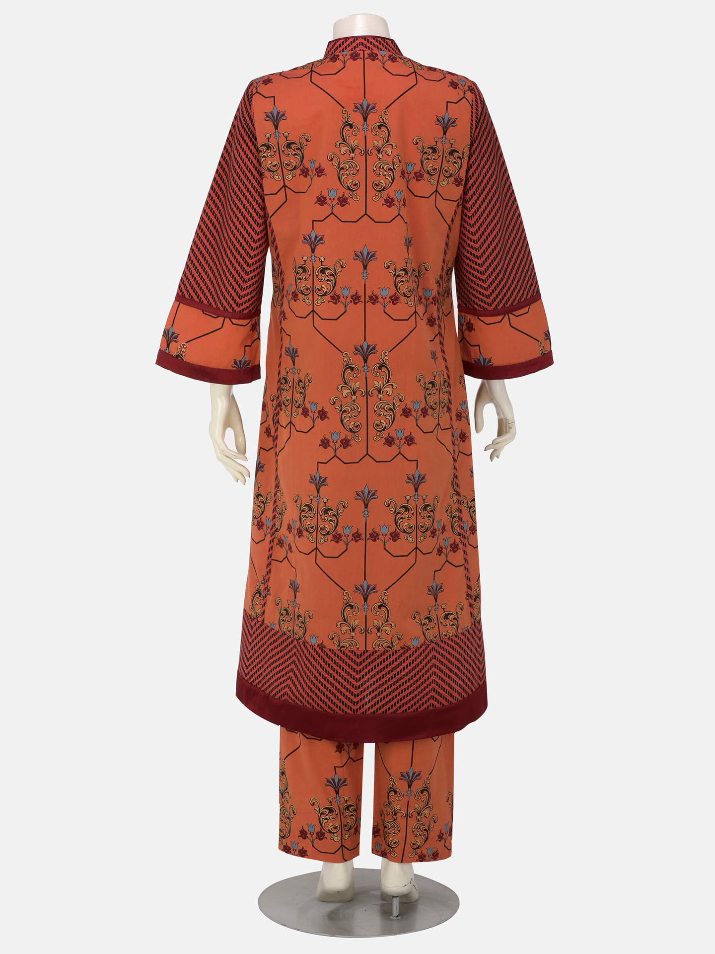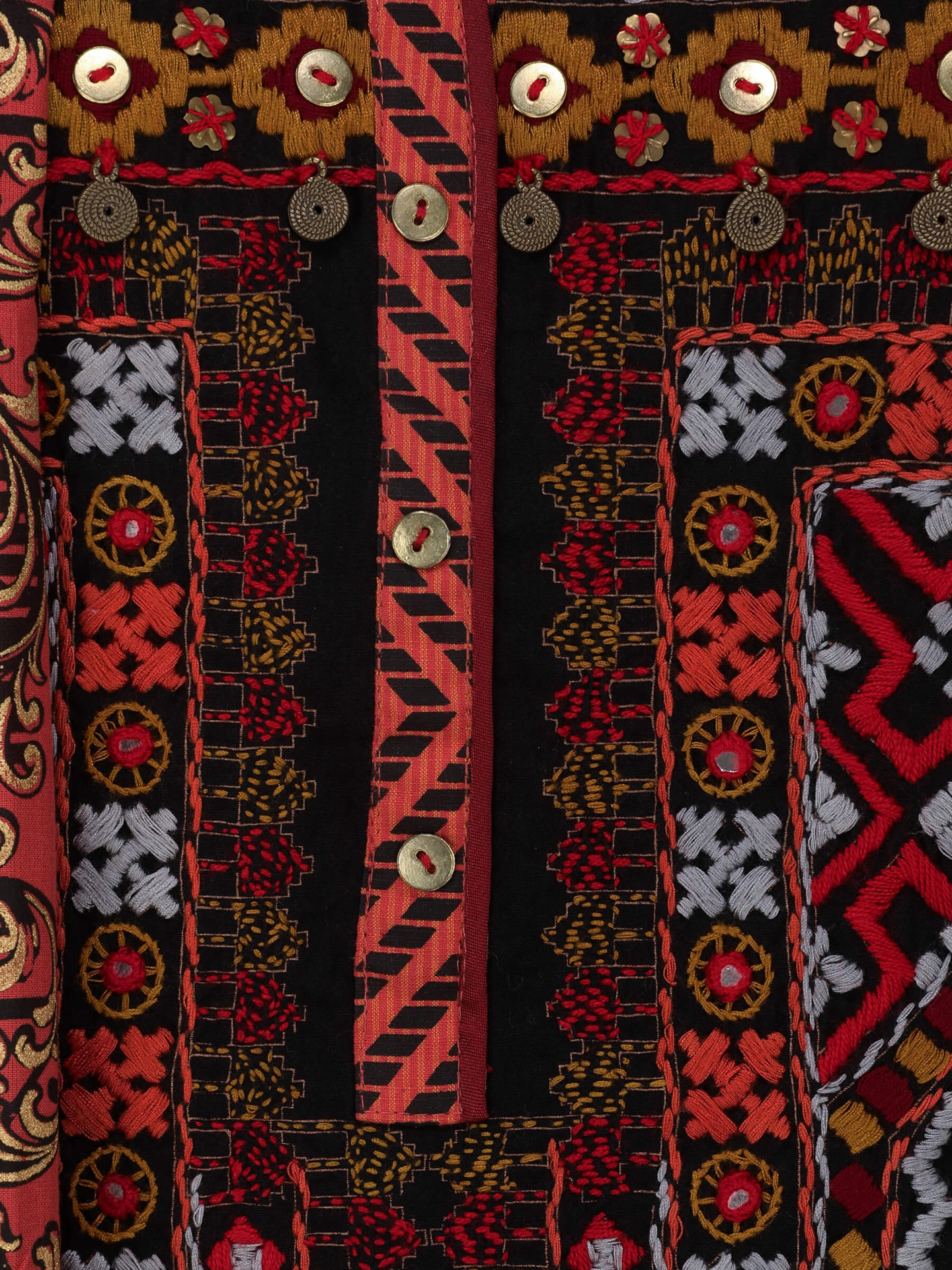 Black cotton kameez with multicolour print, embroidery and threaded mirror details. Comes with orange slub cotton stripe shalwar and coral dobby textured printed cotton dupatta with fringe trim.