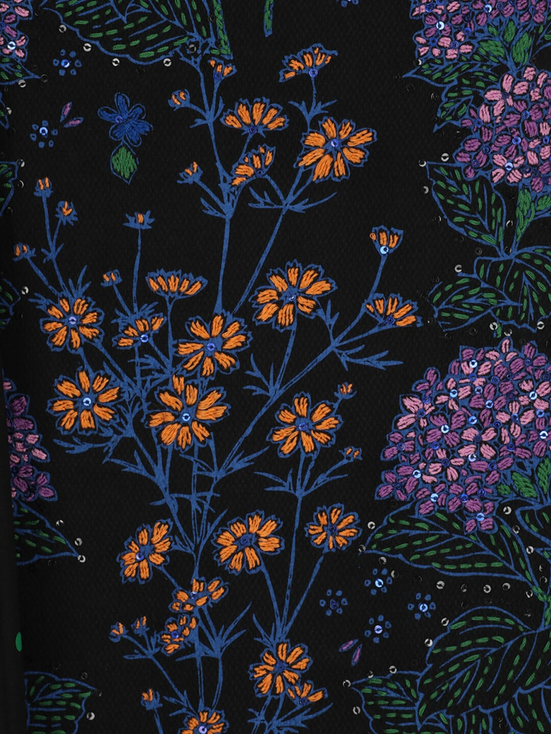 Black printed viscose-cotton kameez with multicolour embroidery all over body. Comes with black cotton shalwar and printed voile dupatta.