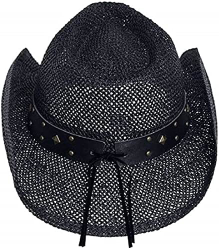 Men's ultra-cool straw cowboy hat in black with shapeable brim edges. Featuring a dark nickel color Longhorn accent in front and a black 1.5 inch wide faux leather band with antique brass color studs. One size fits most up to 24 inches. Interior features an elastic interior sweatband for a snug fit. Hat includes free size reducing tape. If fit is to loose, simply apply tape to interior of hat, behind the sweatband, to reduce size. The 3.5 inch brim features hidden wire in edges which makes the hat shapeable. Adjust the brim to your favorite style. A great fashion piece. Available for a limited time only. Makes a great gift!