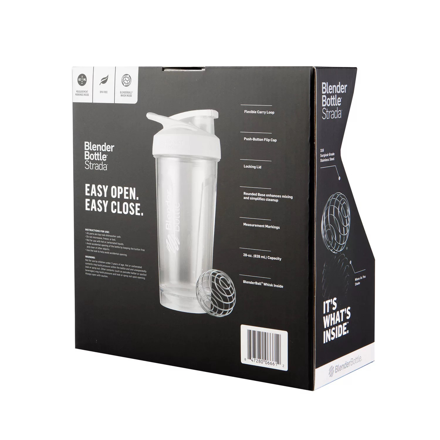 Save the strength work for the gym. The BlenderBottle Strada protein shaker opens effortlessly with just the push of a button. Snap shut the secure-lock lid for a quick, leak-proof seal. Say goodbye to lumpy protein shakes. This powerful mixing system uses the BlenderBall wire whisk—found only in BlenderBottle brand shakers—to deliver smooth protein and nutrition shakes with ease. Forgot to add liquid first? No sweat. The rounded base allows the BlenderBall whisk to mix every last bit of powder. A flexible, ergonomic carry loop provides a comfortable hold for easy portability. Or use the loop to secure keys or attach the bottle to a gym bag. We use premium, durable Eastman Tritan plastic to help keep your bottle fresh and odor-free.