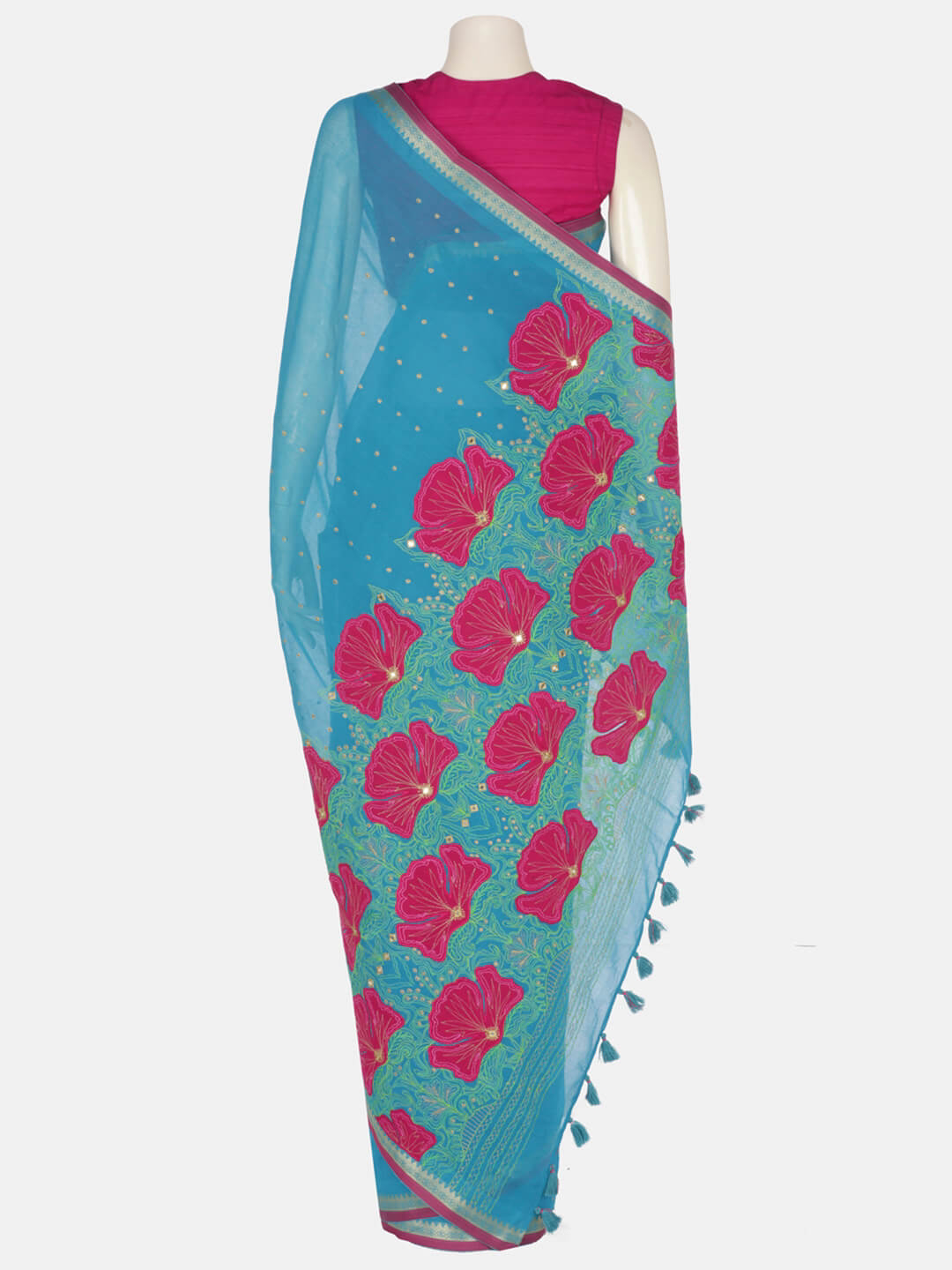 Blue appliqued cotton saree with prints and embroidery. Features tassel trimmed aanchal. Comes with matching unstitched blouse piece.