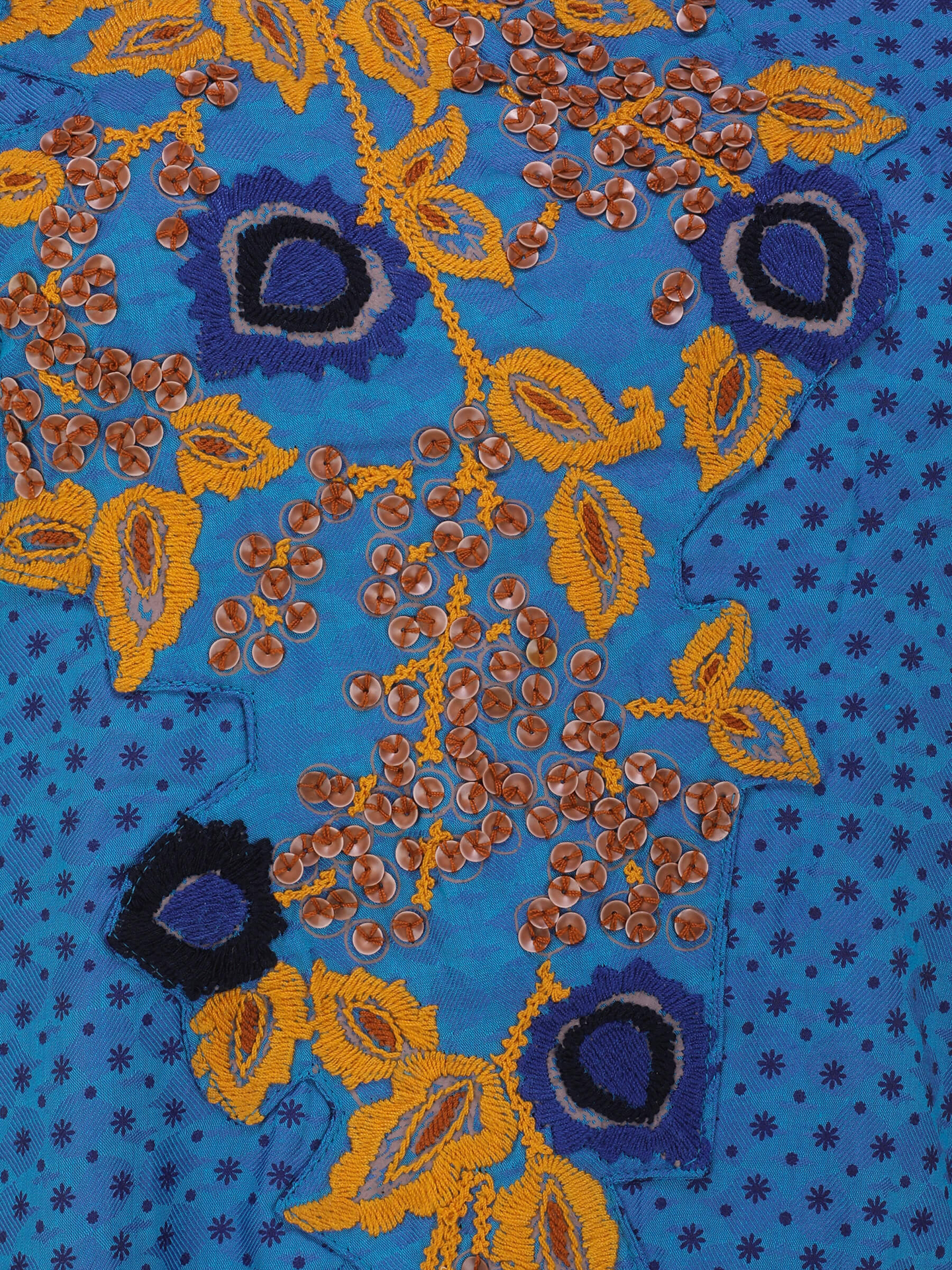 Blue printed jacquard viscose kameez with light brown printed cotton patch detail. Shades of brown and blue and embroidery. Comes with printed jacquard viscose shalwar and printed handloom cotton dupatta.