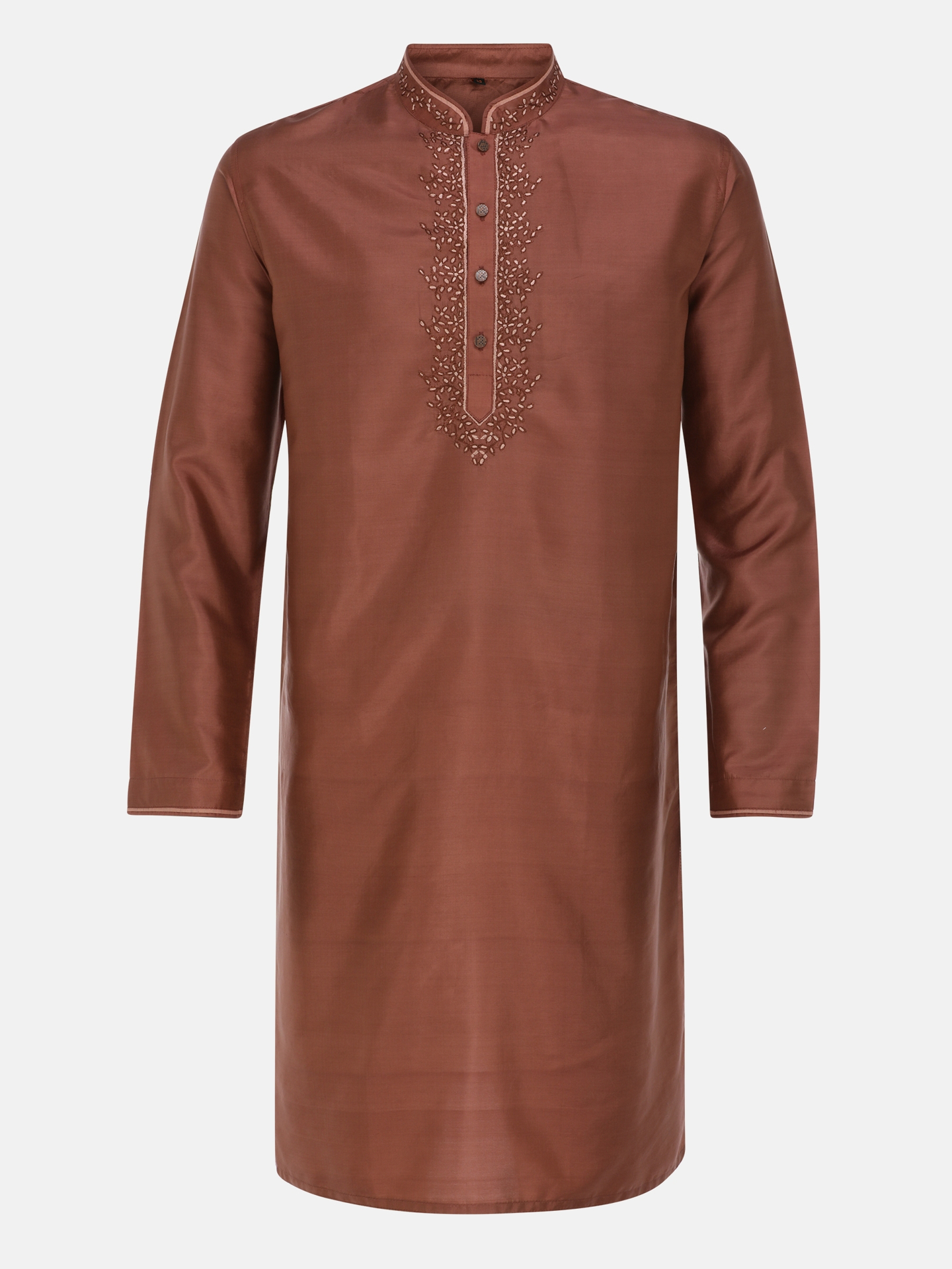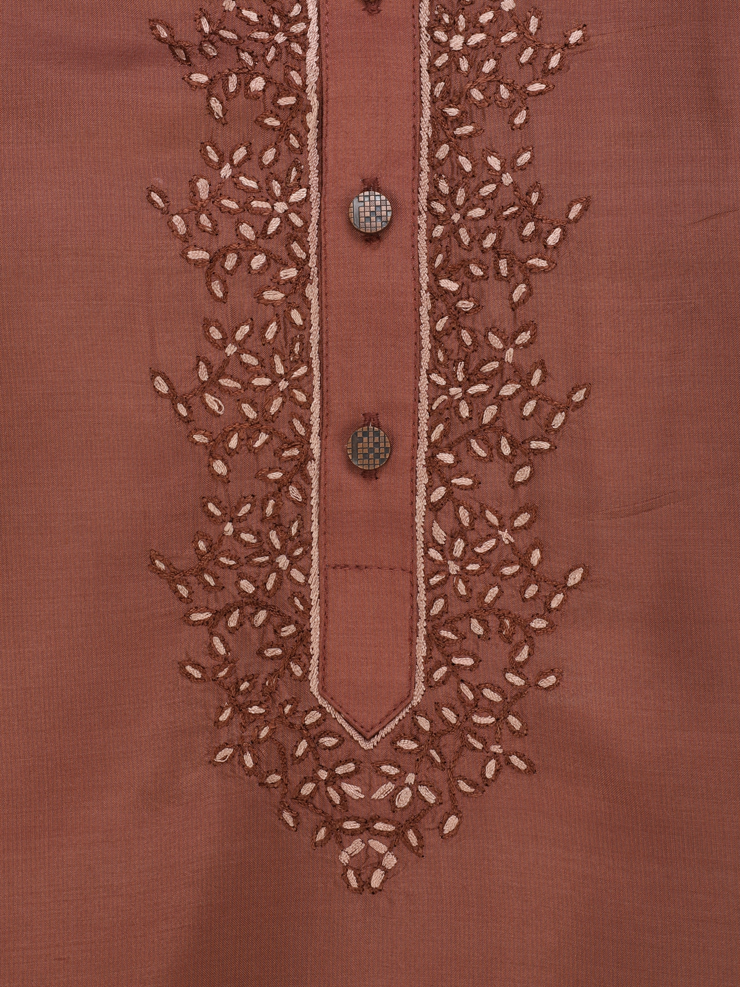 Brown silk panjabi with shades of brown embroidery. Comes with cotton pajama with drawstring, button fly and elastic waist.