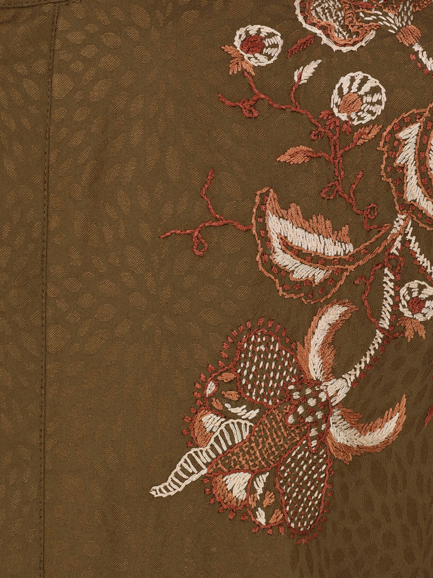 Brown textured slim fit viscose-cotton panjabi with brown and beige embroidery.