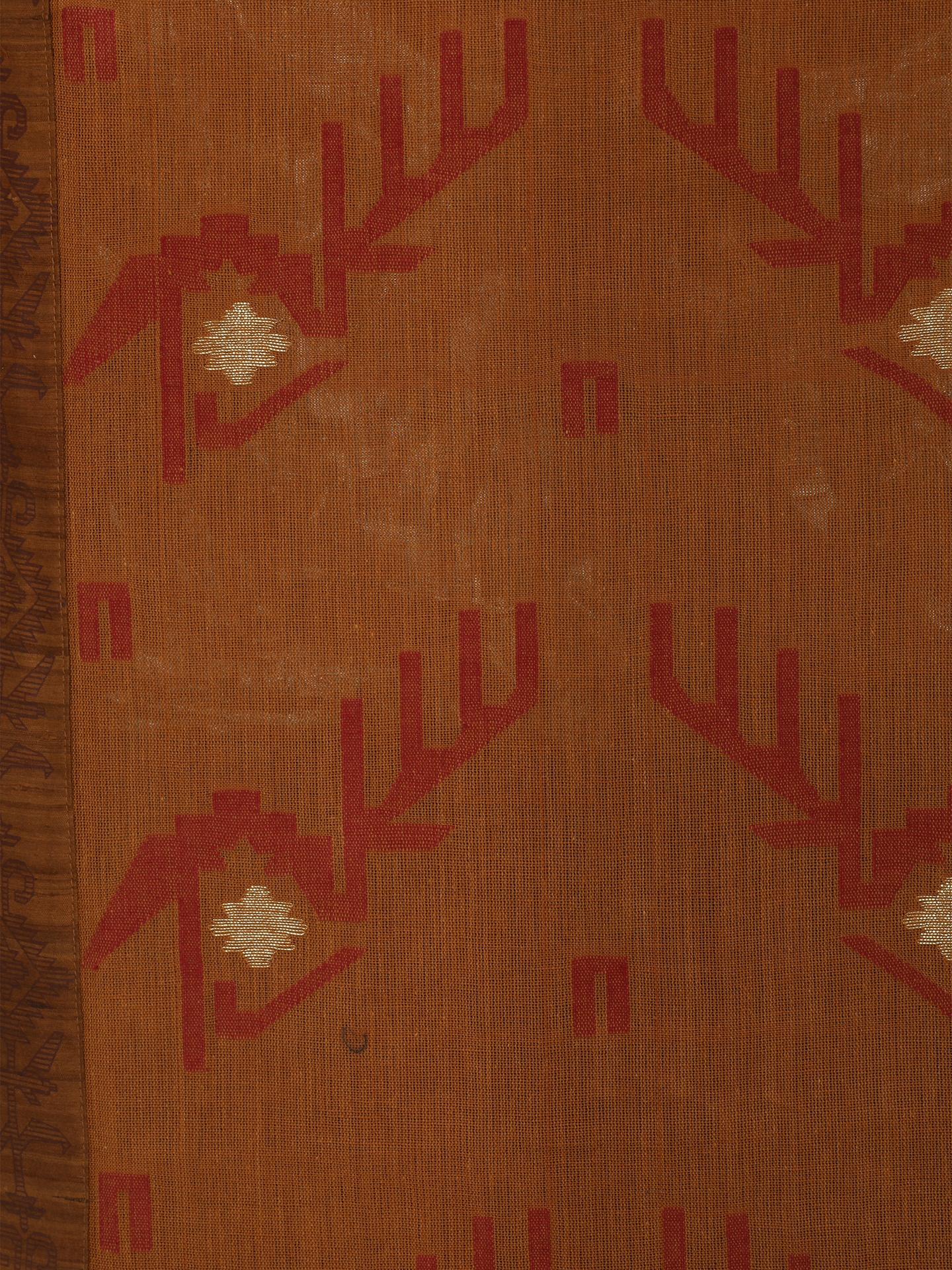 Brown cotton jamdani panjabi with red and golden weaving. Printed endi silk trim on both sides.