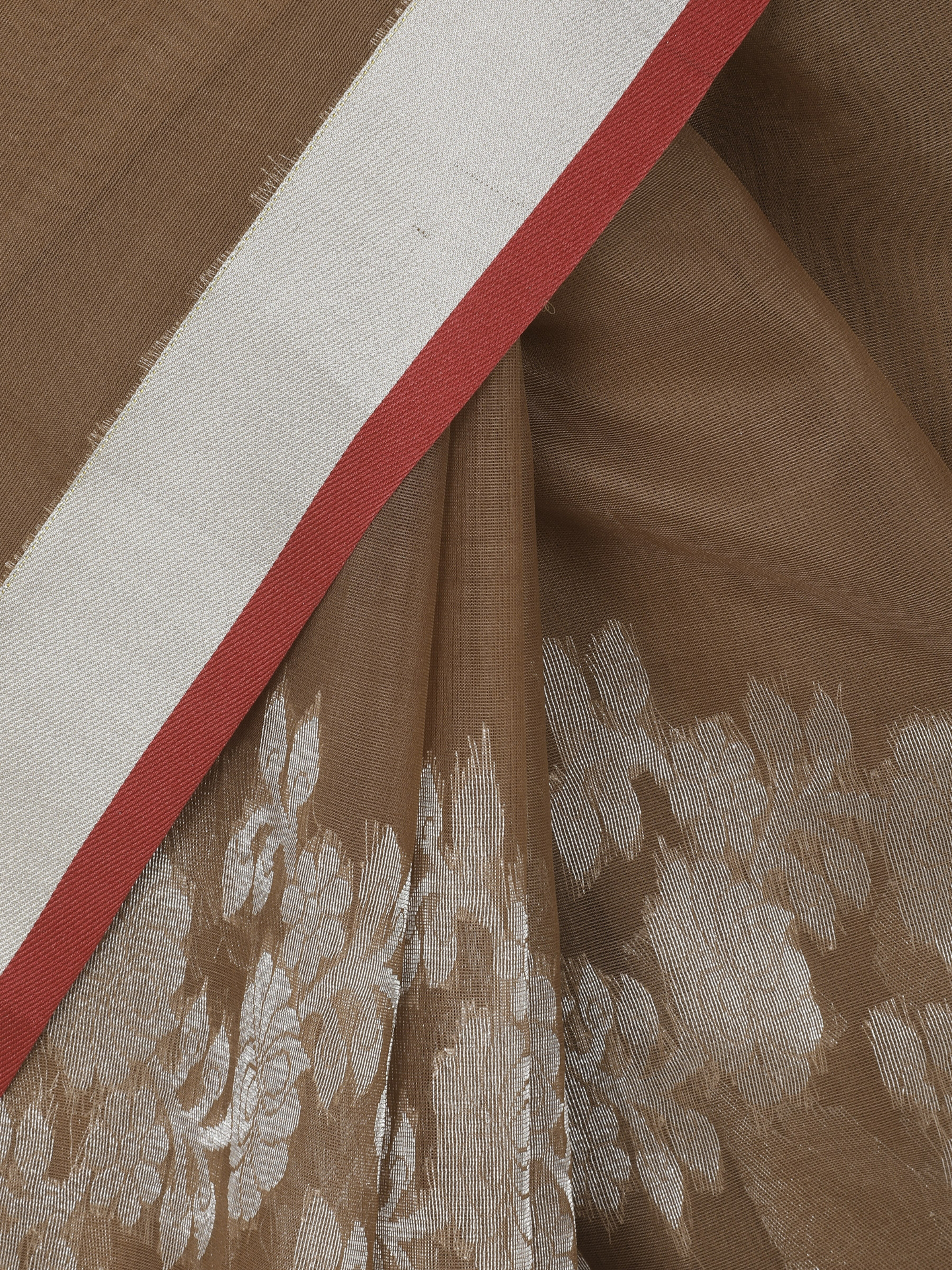 Brown Tangail muslin baluchari saree with silver weaving. Comes with matching unstitched blouse piece.