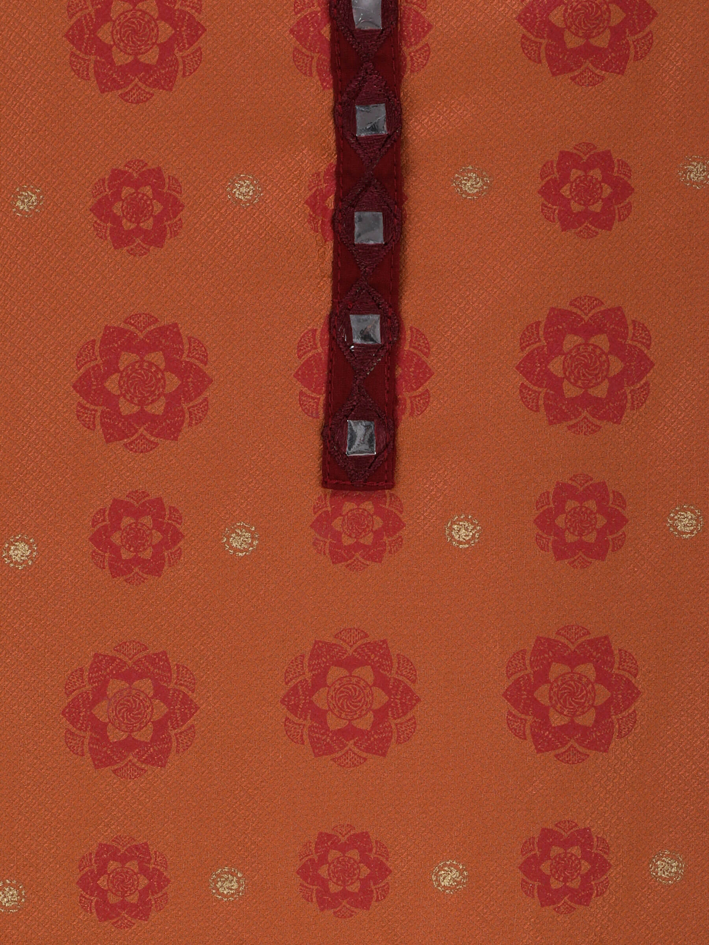 Burnt orange dobby textured kameez with maroon print, multicolour embroidery on maroon patch. Comes with burnt orange printed viscose-cotton shalwar and maroon printed voile dupatta with fringe trim.