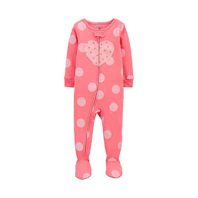Zips from ankle to chin. Cuddle tab to protect little chins up to size 5T. Footed with elasticized backs and grippers.