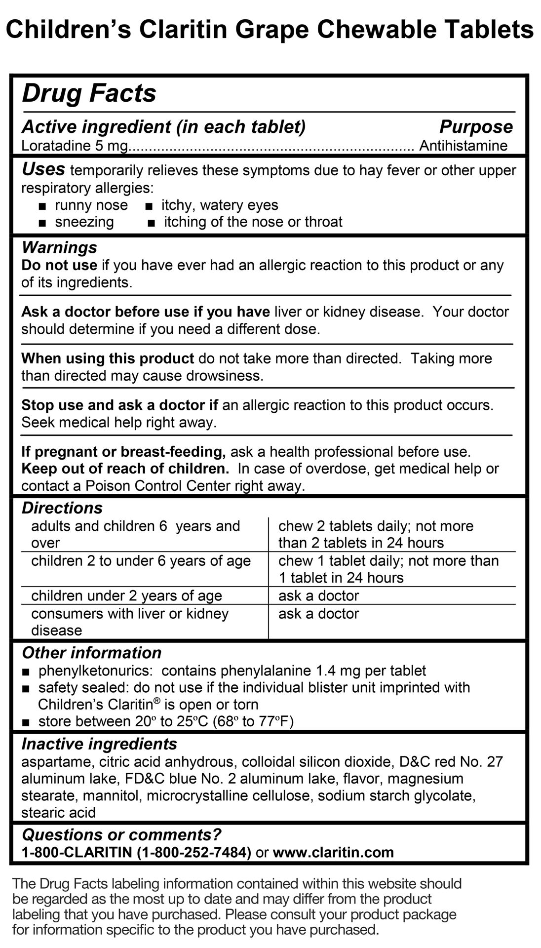 Children's Claritin 24-Hour Non-Drowsy Chewable Tablets provide effective, 24-hour allergy relief of your child’s allergy symptoms, like sneezing, runny nose and itchy, watery eyes. These chewable antihistamine tables come in kid-approved grape flavor and provide relief fast. These are for children ages 2+. Each tablet contains 5 mg of loratadine.