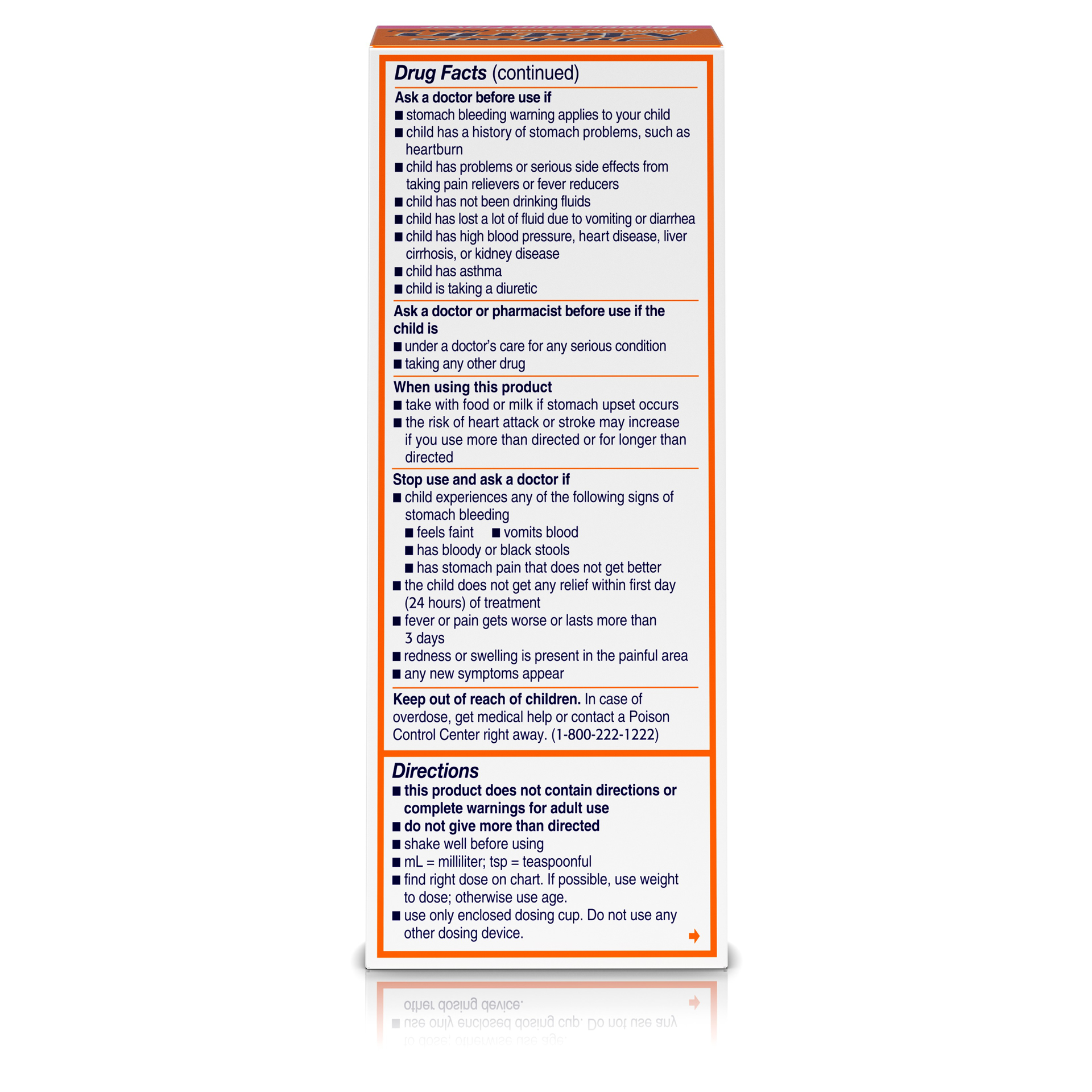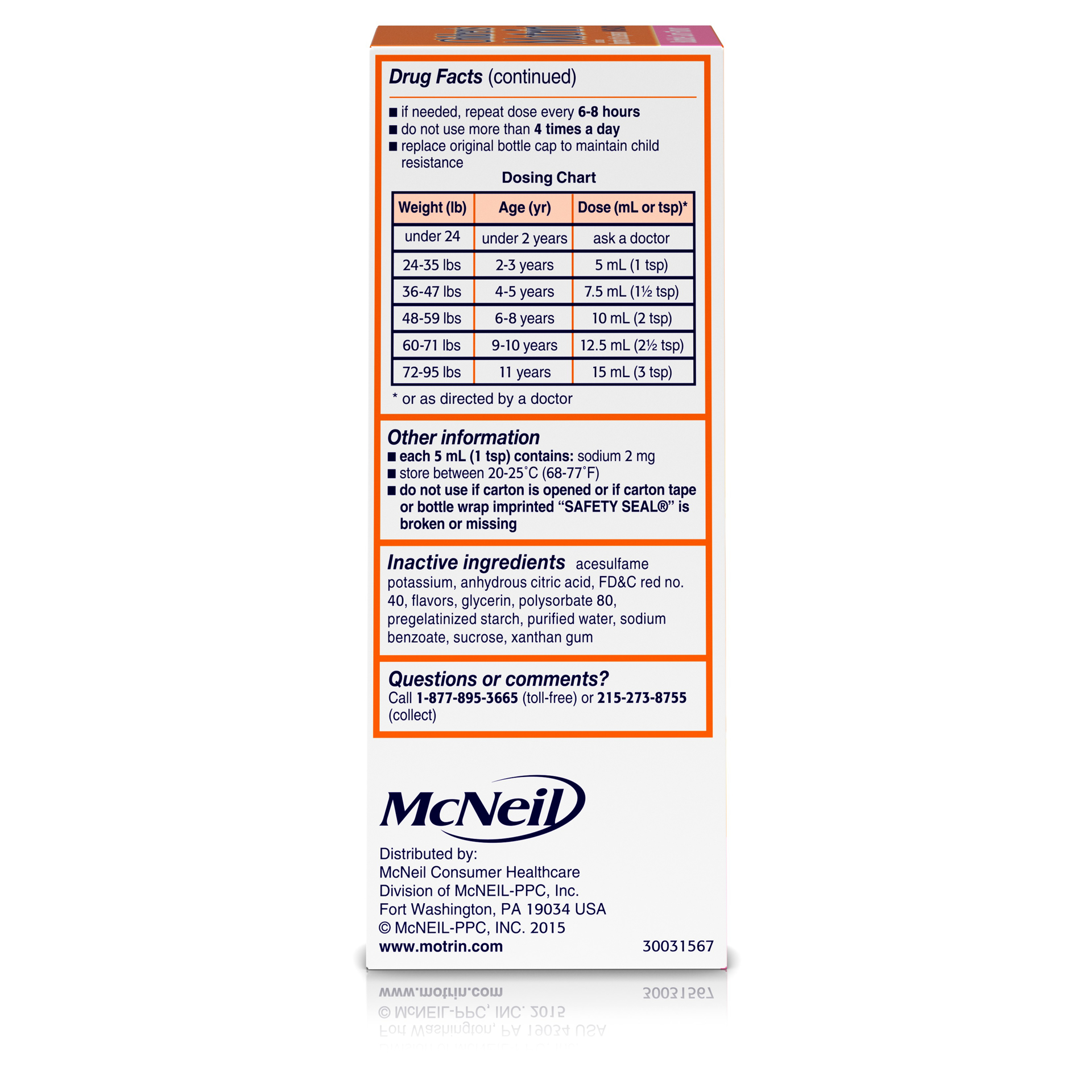 When your child isn't feeling well, you need something that acts quickly and is long-lasting. Motrin does the trick, providing up to eight hours of relief for minor aches and pains. The oral suspension that temporarily reduces fever For children ages 2-11 Contains ibuprofen Temporarily relieves minor aches and pains due to the common cold, flu, sore throat, headache, and toothache Lasts up to 8 hours