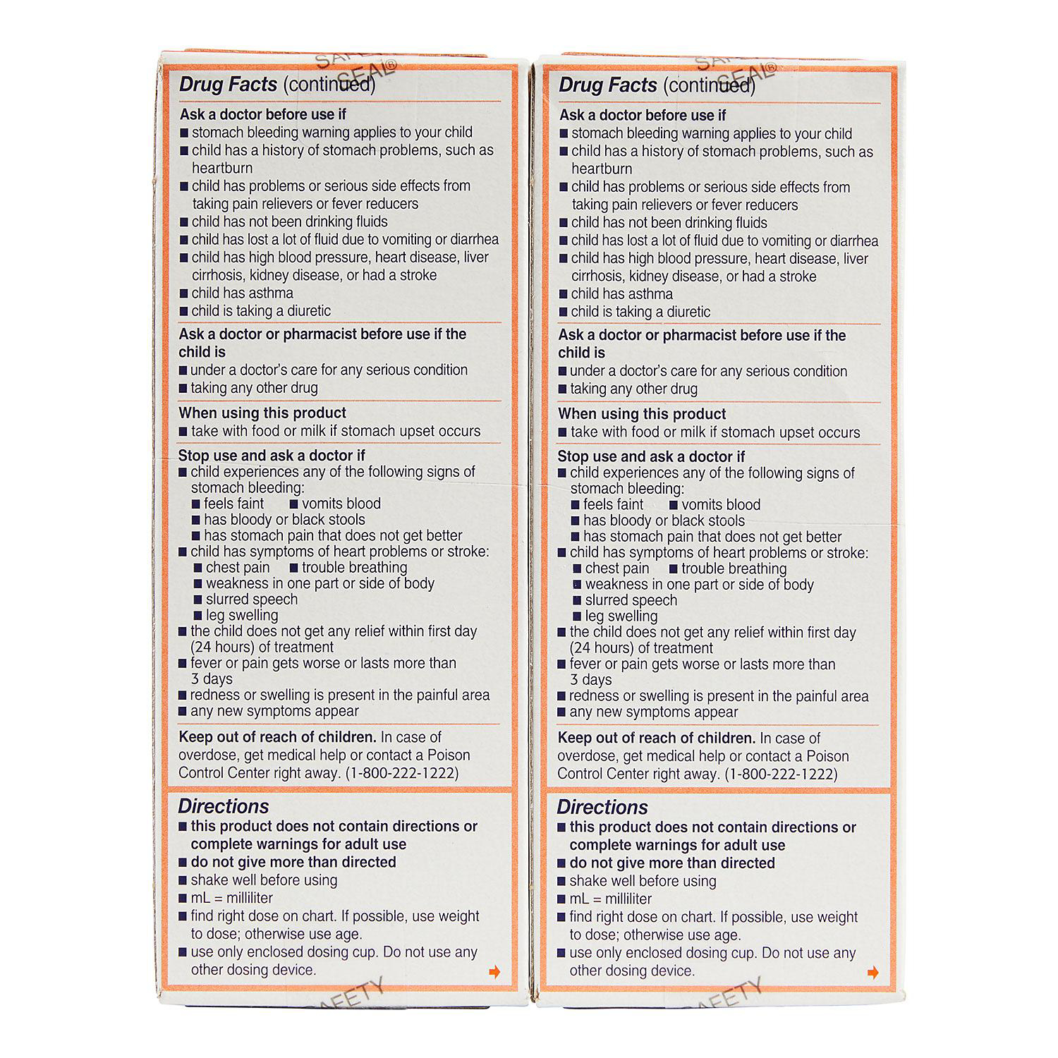 This pack contains two four-fluid-ounce bottles of Motrin oral suspension for children ages two to 11 years. Each teaspoon serving contains 100mg of ibuprofen oral suspension (NSAID) that quickly reduces minor pain and fever for up to eight hours. Its dosing chart included on the package helps show parents the ideal amount of ibuprofen suspension for their child's weight, to help take the guesswork out of safe and effective dosing. If it's still needed, repeat the dosing every six-eight hours but do not dose more than four times a day. If symptoms worsen or persist, be sure to contact your pediatrician or family doctor.