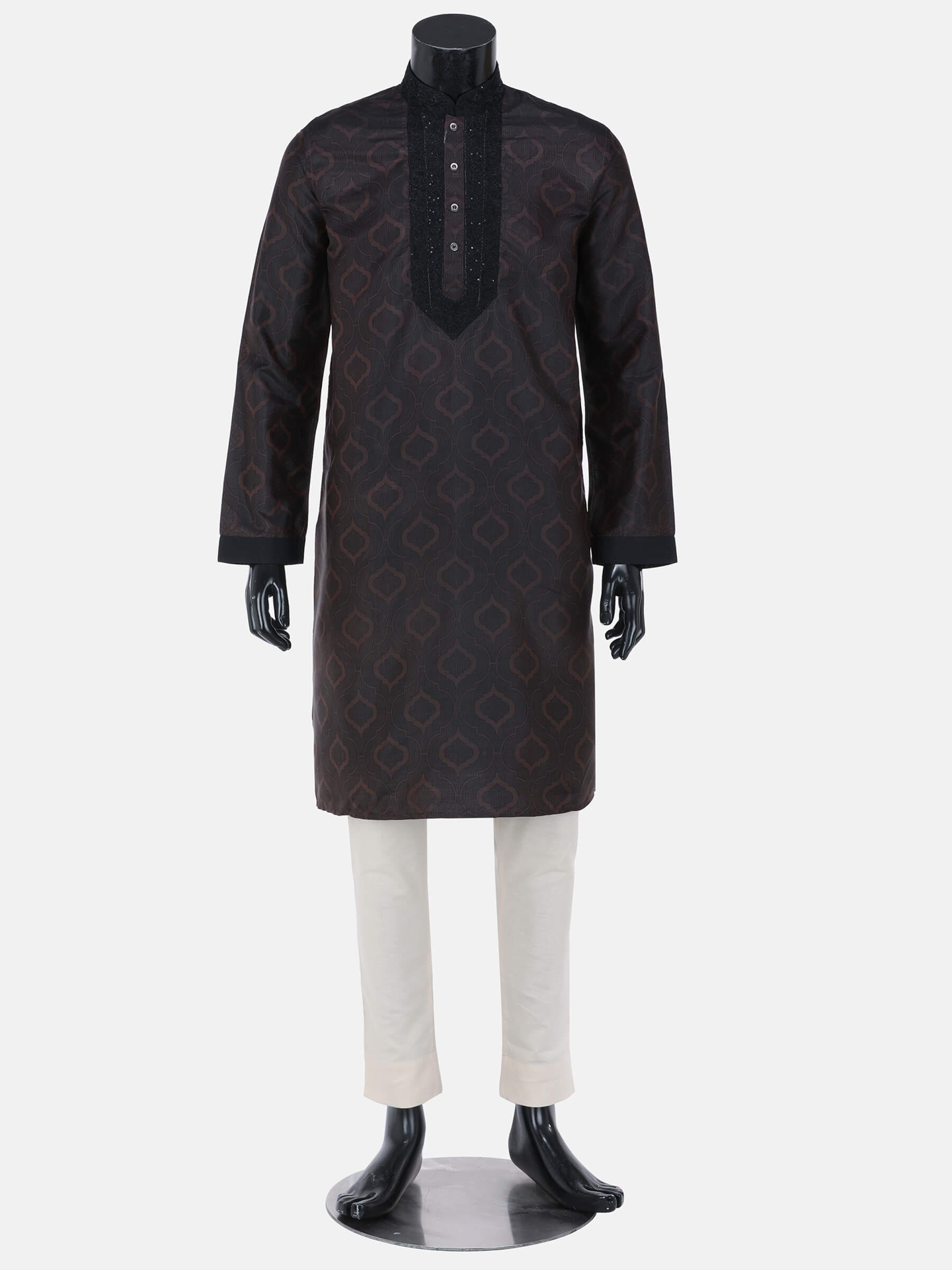 Chocolate and black printed silk panjabi with black erri embroidery. Comes with beige ramie cotton pajama.