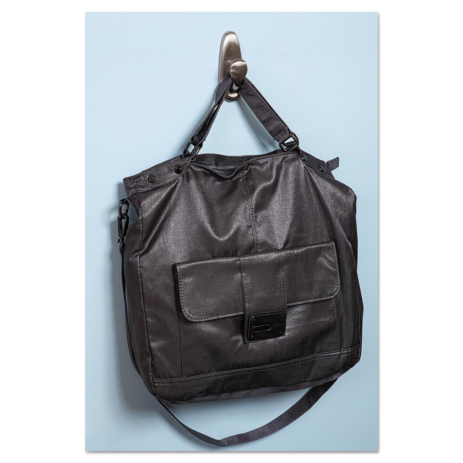 A Command Hook, Large, 5lb Capacity, Brushed Nickel Finish, 1 Hook & 2 Strips can hang large bags or photos in an attractive metallic color.