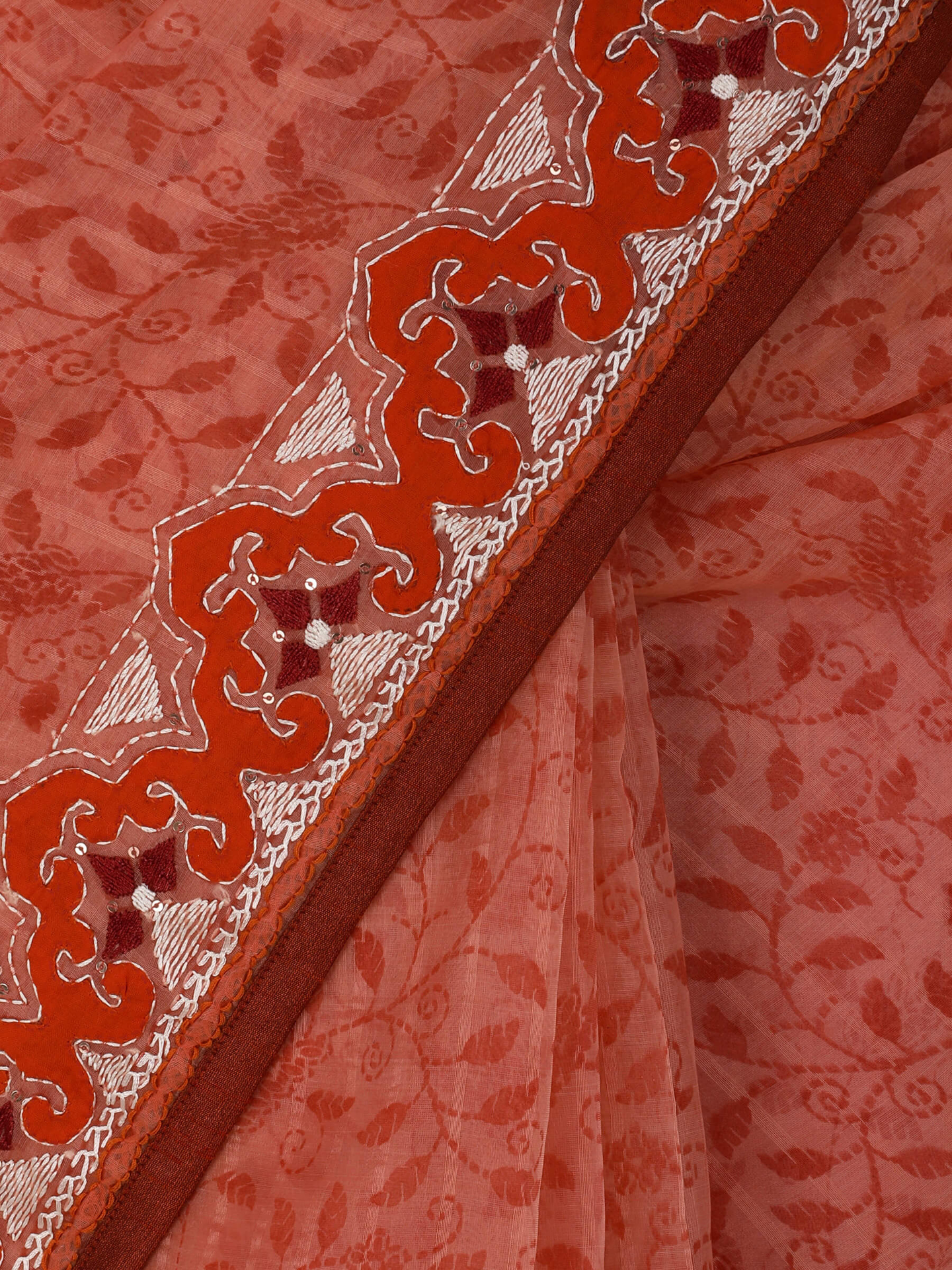 Coral printed and embroidered muslin saree with orange hand appliqued. Features tassel trimmed aanchal. Comes with matching unstitched blouse piece.