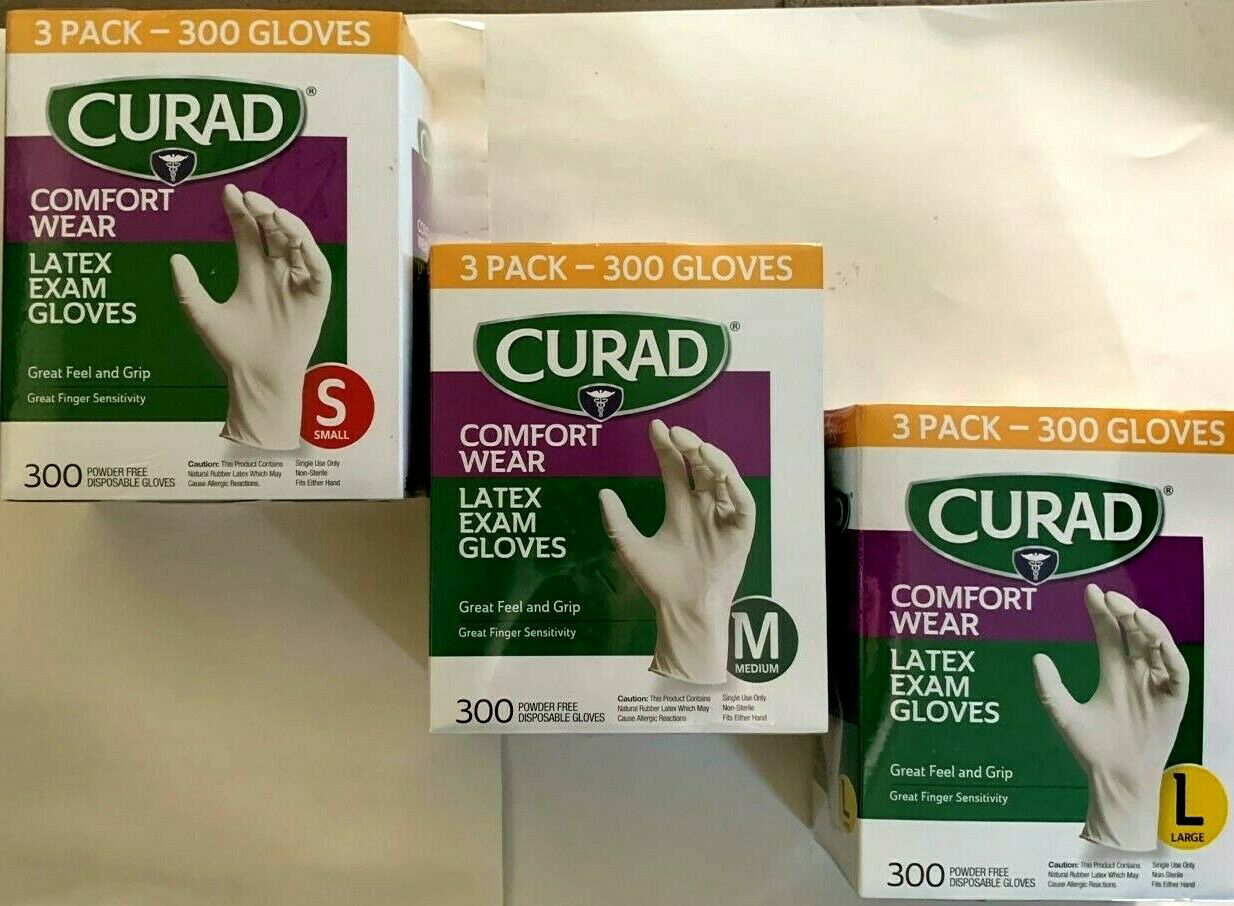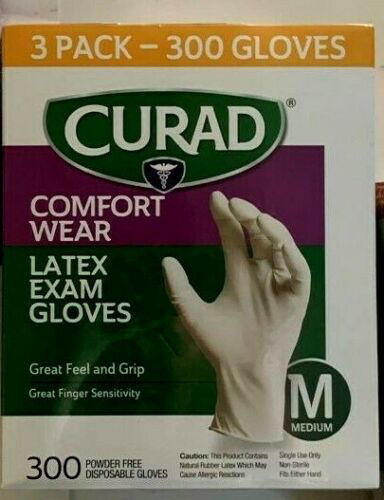 #300 Count (3 boxes of 100 each). #Great feel, grip, and finger sensitivity. #Non-sterile. #Powder-free. #Disposable, single use only. #Fits either hand. #Model: CUR8106. #Comfort Wear Latex Exam Gloves. #Powder-free. #Large, MEDIUM,SMALL. #100 gloves per box. #3 boxes. #300 gloves total.