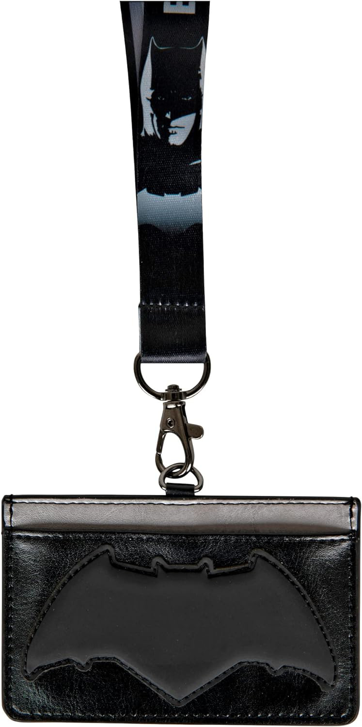 INCLUDED IN THE PURCHASE OF BATMAN KEYCHAIN LANYARD FOR WOMEN AND MEN - Includes 1 Batman Soft Touch Dangle Lanyard with clear badge holder and metal clip. The Batman stylish lanyard with ID holder features black and grey design with Batman text, Batman's face, and bat figures on the back, while the leather card holder features a Batman icon emblem design with the word Batman on top of it, as well as an engraved Batman emblem on the back.