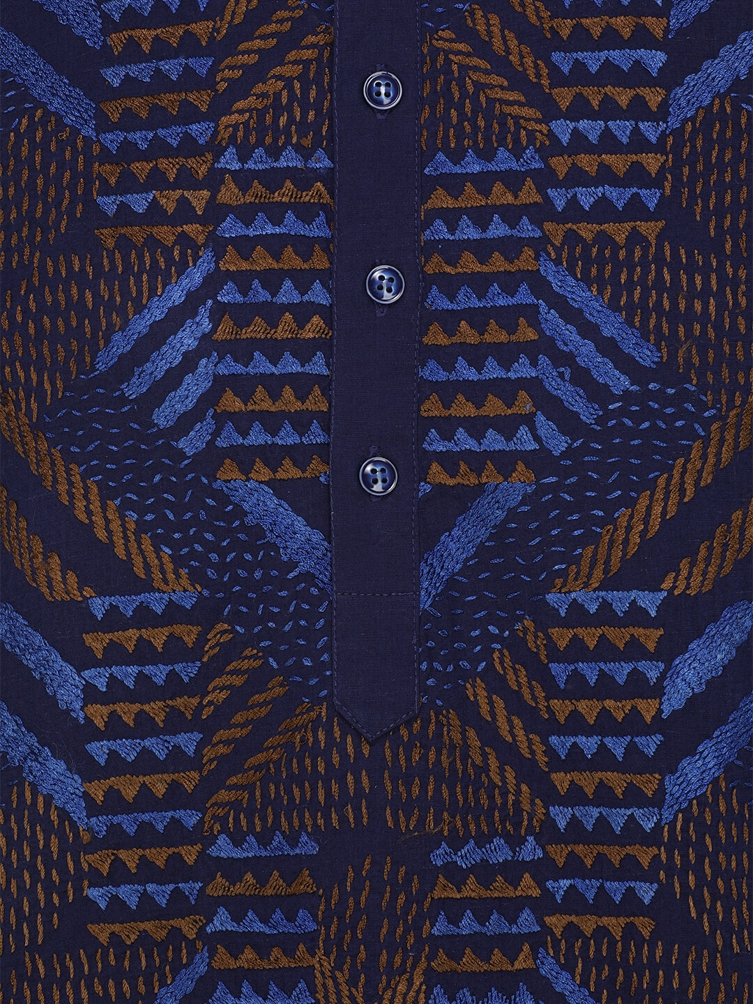 Deep blue cotton panjabi with all over exclusive embroidery. Additional erri embroidery on neckline. Black viscose-cotton pajama with drawstring, elastic waist and button fly.