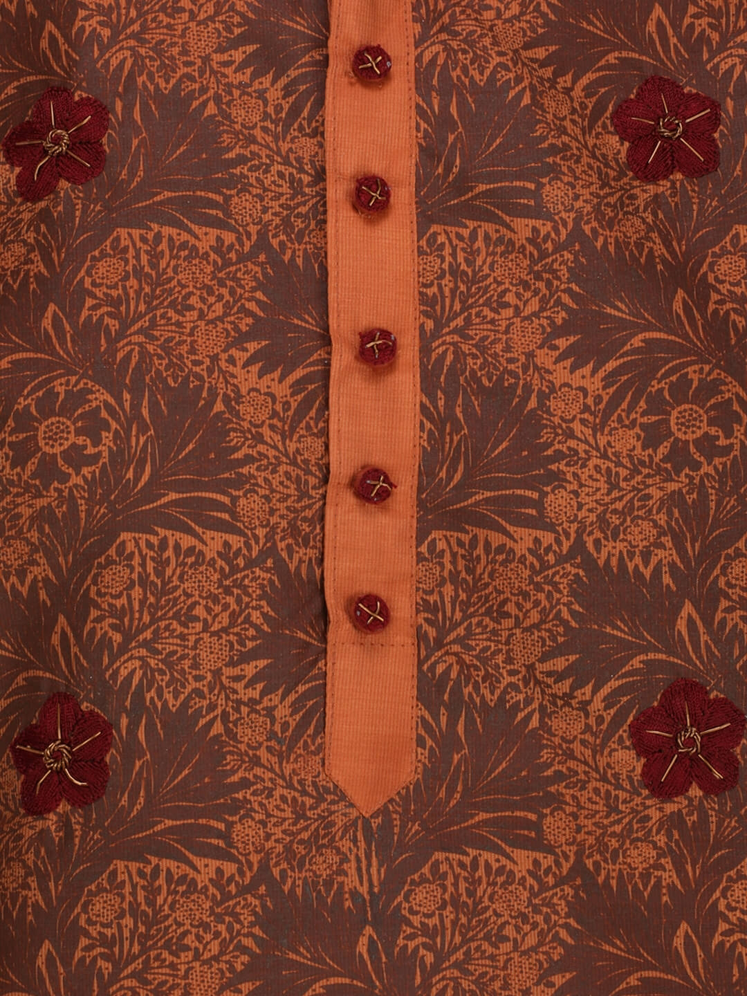 Deep brown silk panjabi with orange prints and erri embroidery. Features in-seam pockets. Pair with pajama, waistcoat and other accessories.