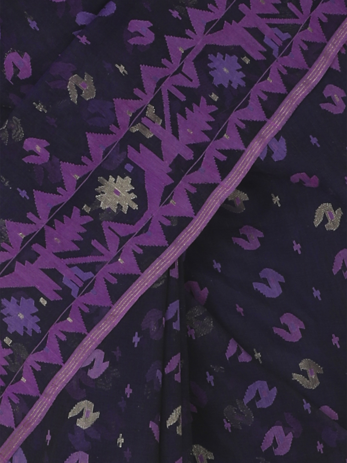 Deep purple half silk jamdani saree with purple, mauve and golden buti. Comes with unstitched blouse piece.