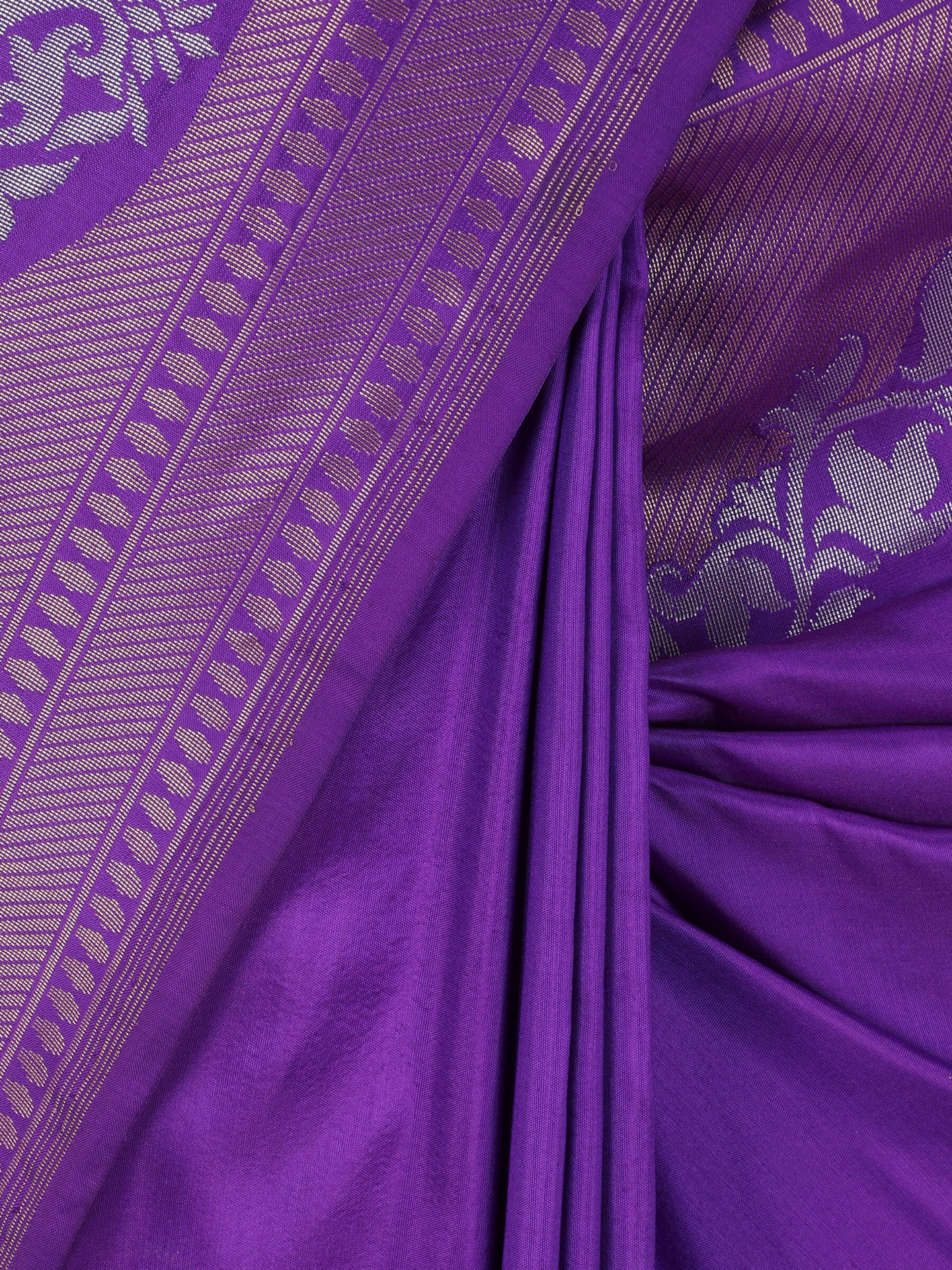 Deep Purple Mirpur katan saree with weaving. Aanchal with fringe trim and comes with unstitched blouse piece.