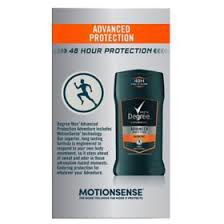 This Degree antiperspirant is a deodorant stick for men that helps keep you dry and odor-free. It provides protection against body odor and sweat for up to 48 hours. Its special formulation is prepared using unique MotionSense technology, which helps keep you fresh with every movement and makes the Adventure scent last longer. Adventure is a clean citrus scent. The stick is easy to apply with a glide-on technique and can be used for everyday protection.