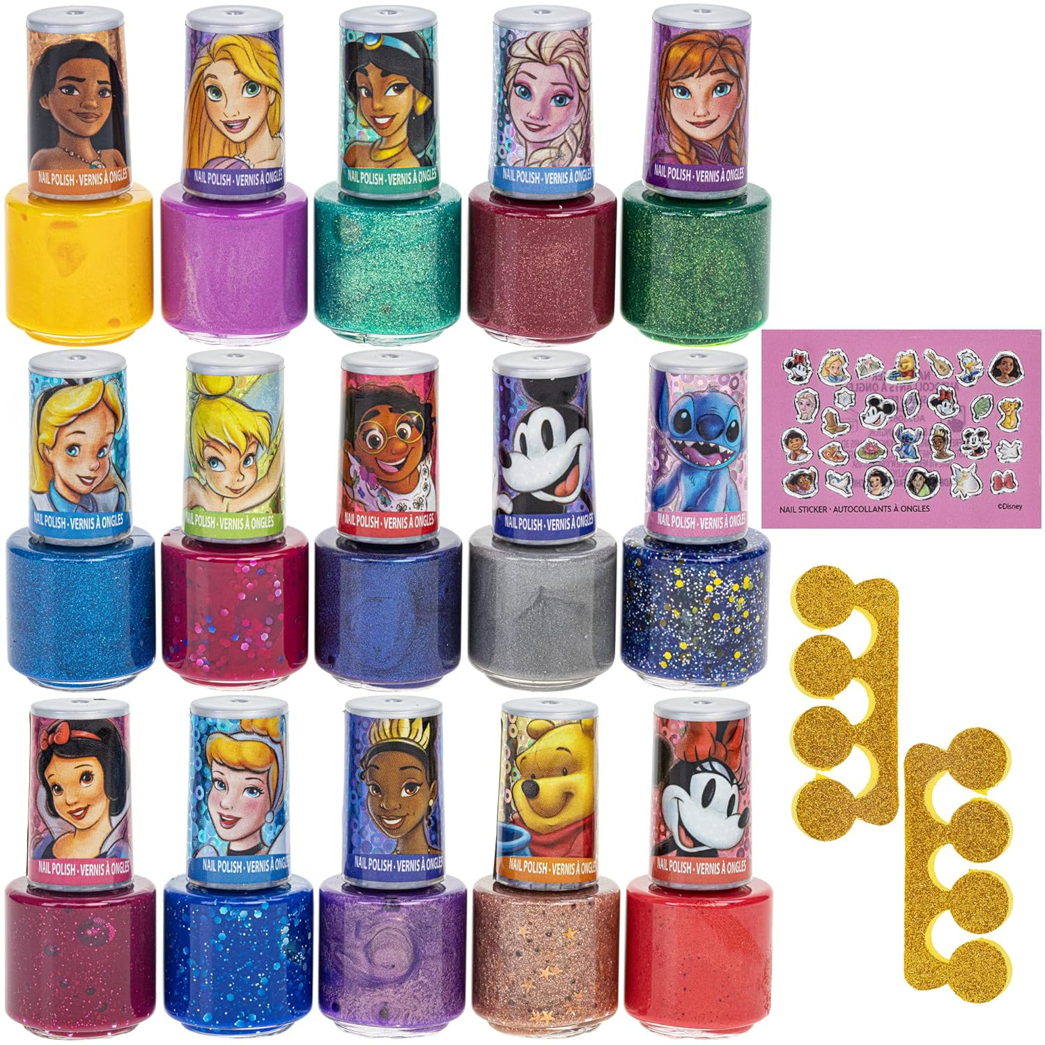 Girl Disney Princess Non-Toxic Peel-Off Nail Polish Set for Girls, Glittery and Opaque Colors, Ages 3+ 15 Pack This set includes 15 nail polish bottles, including glittery and opaque colors Shades include: Pink, Yellow, Green, Orange, Sky Blue, Dark Blue, Red and more Box Size: Item Size: 11.5" x 1" x 12"