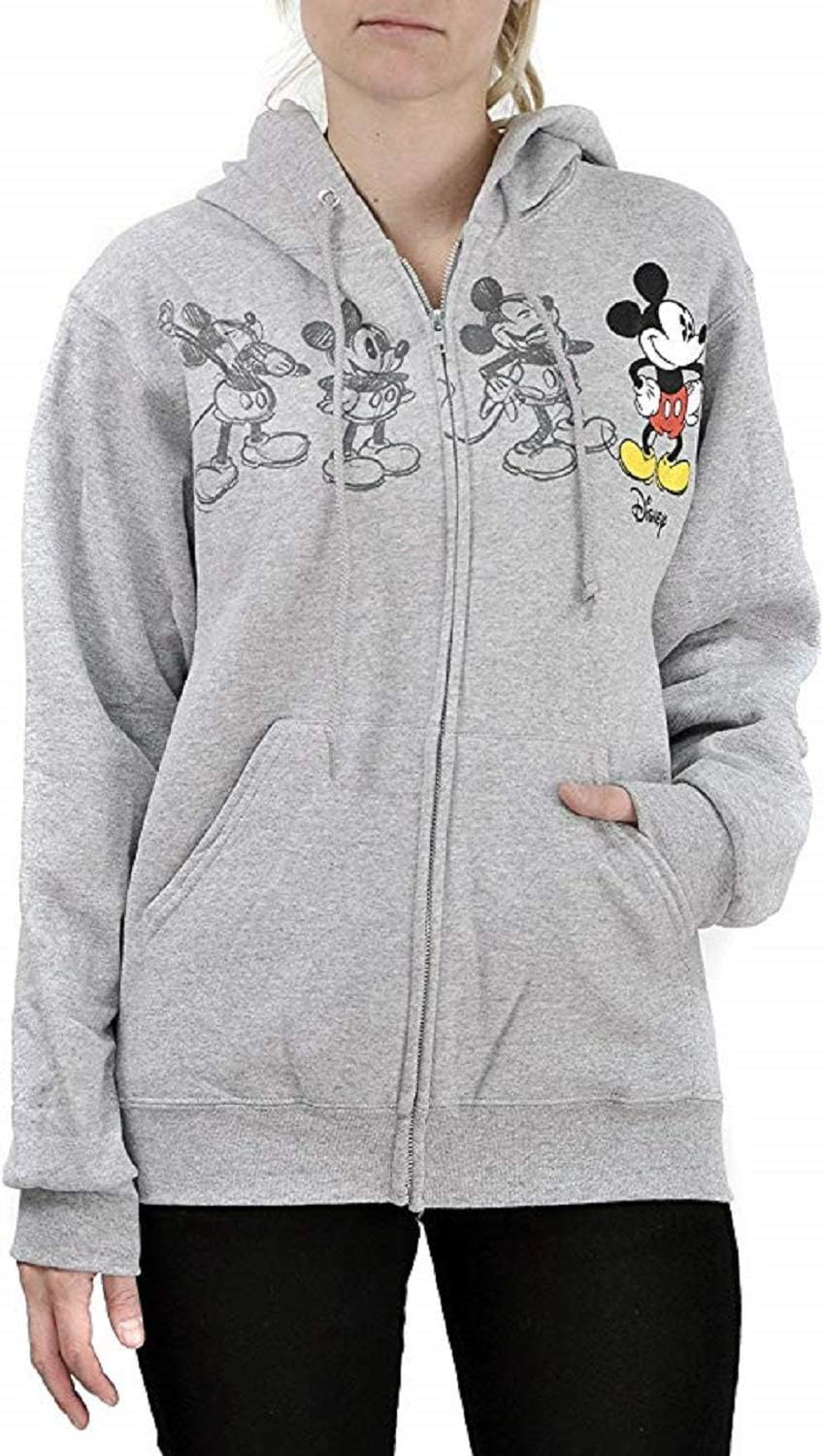 Disney women's Mickey Mouse zip hoodie. Heather gray with classic animation sketch design. Front pouch pockets, cuffed sleeves and waist. Soft cotton/poly blend. Officially licensed.