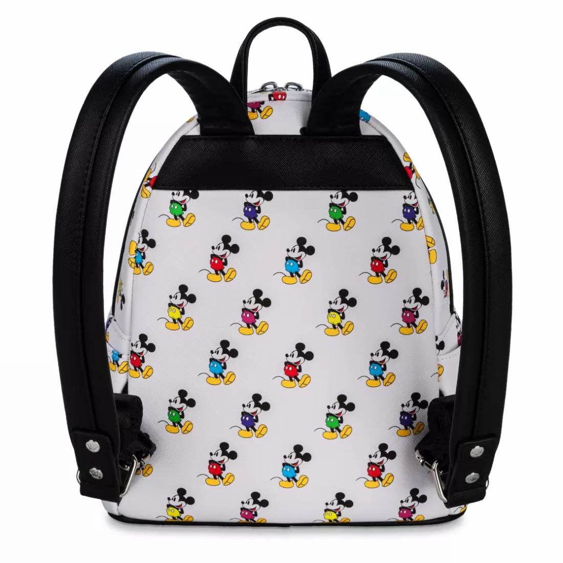 Mickey Mouse's classic standing pose has been given a novel twist with his shorts featured in a rainbow of different colors on this mini backpack from Loungefly. The allover Mickey print stands out on the white simulated leather of this compact carryall that's perfect for all your everyday essentials.