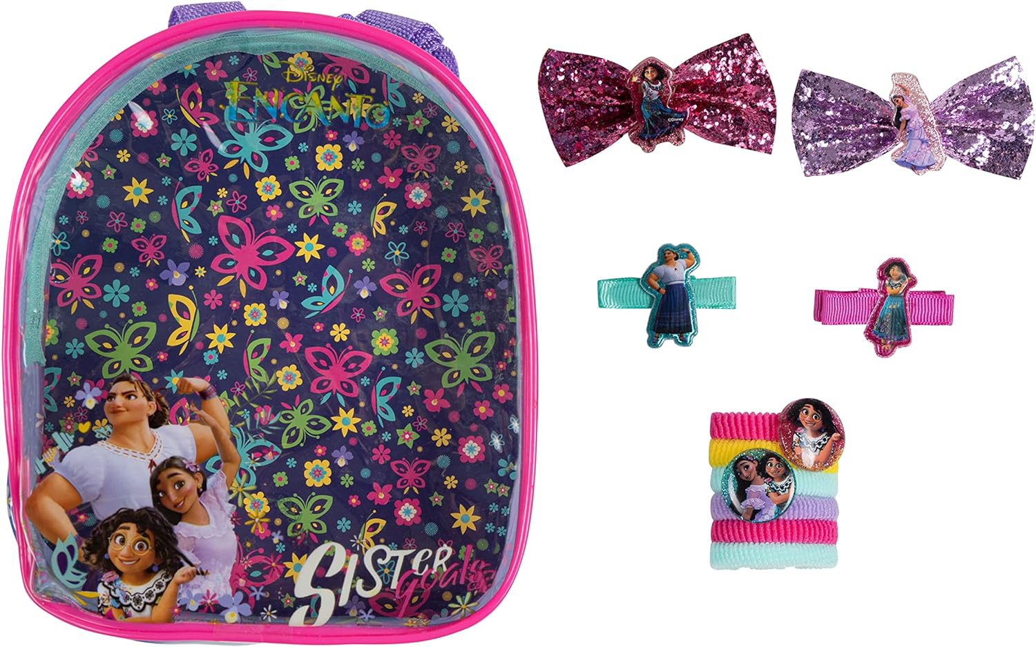 All in one styling set - These styling supplies come in a cute, transparent bag printed with an Encanto character. Girls Backpack with Accessories includes a backpack and assorted hair styling accessories for kids such as 2 salon clips, 2 hair bows, and 6 terry ponies; a cute bag with high quality hairstyling accessories designed for hair styling followed by a handy small backpack makes cleanup a breeze and allows your kid to bring their fave accessories anywhere!