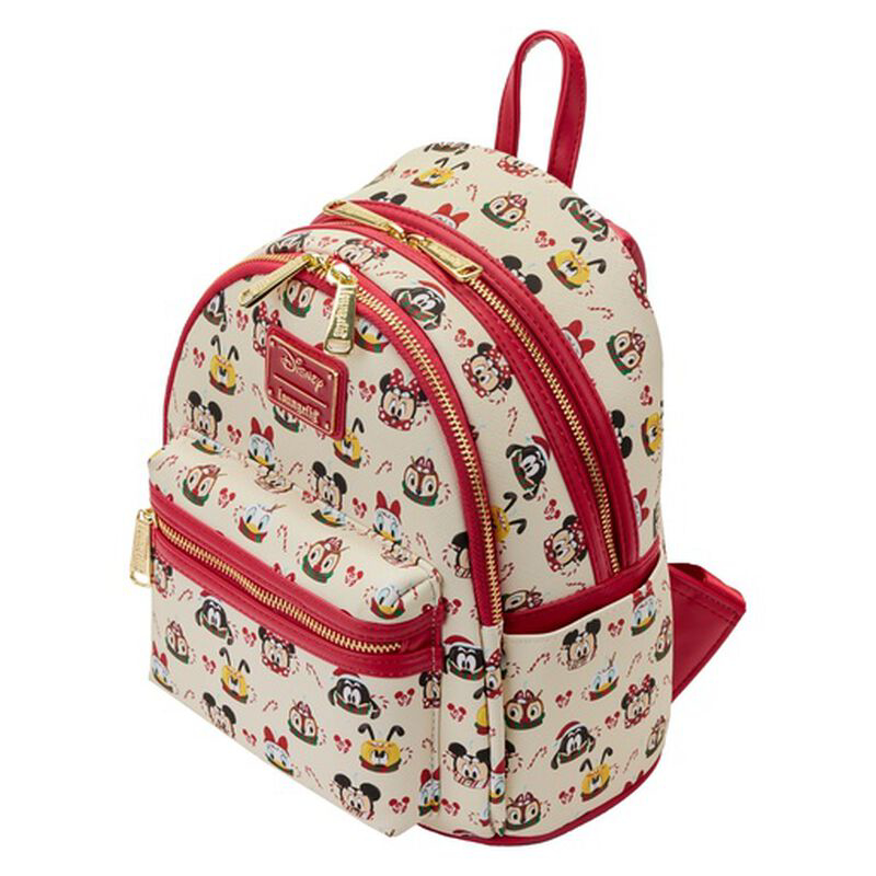 Cheers for the ears! Share in a holiday toast with this Loungefly Disney Hot Cocoa All Over Print Mini Backpack with Headband Combo. You’ll have everything you need to remain head and shoulders above the holiday crowd. This mini backpack features a festive print of cherished Disney characters as holiday mugs. You’ll find Pluto, Goofy, Donald Duck, Daisy Duck, Mickey Mouse, and Minnie Mouse. A front zipped compartment offers more room for your daily necessities. At the top, there’s an insert of the Mickey Mouse and Minnie Mouse Mugs Headband, which you can wear whenever the spirit strikes you. Applique details bring Minnie and Mickey Mouse’s ears to life—along with the candy-cane striped handle and holiday scarves that decorate the mugs. The ears slip into a zipper pocket at the top of the front panel and have straps with snaps that go over the headband to keep it in place. Check out the Loungefly embroidery on the side. This combination offers the perfect accessories for dashing about on holiday errands—or for visiting your favorite holiday-themed events.The Loungefly Mickey Mouse and Minnie Mouse Cocoa Mugs Headband is one size fits most and is made of vegan leather (polyurethane). Measurements: 10.5”W x 8.5”H x 1”D