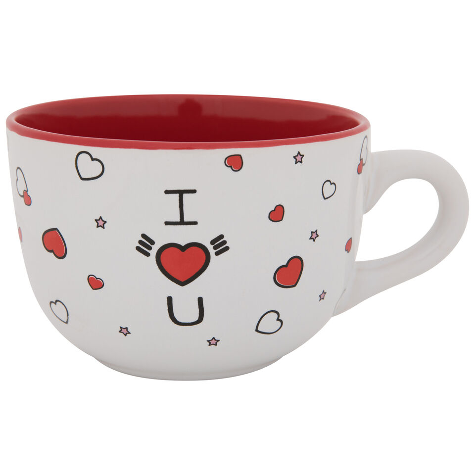 Officially licensed Disney Mickey and Minnie Kissing 14 Ounce Mug. This red ceramic mug features a cute image of "Mickey and Minnie Mouse" kissing. Holds 14 ounces.