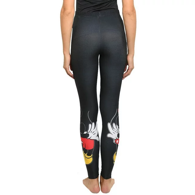 > Womens Juniors Mickey and Minnie Mouse Kissing Leggings Stretch Black > Features a print of Mickey on one leg and Minnie on the other. They are both leaning in for a kiss. > Stretchy fit, simply pull on. 90% cotton, 10% spandex > Officially licensed Disney apparel! > Juniors sizing, measurements are approximate laid flat in inches (un-stretched):