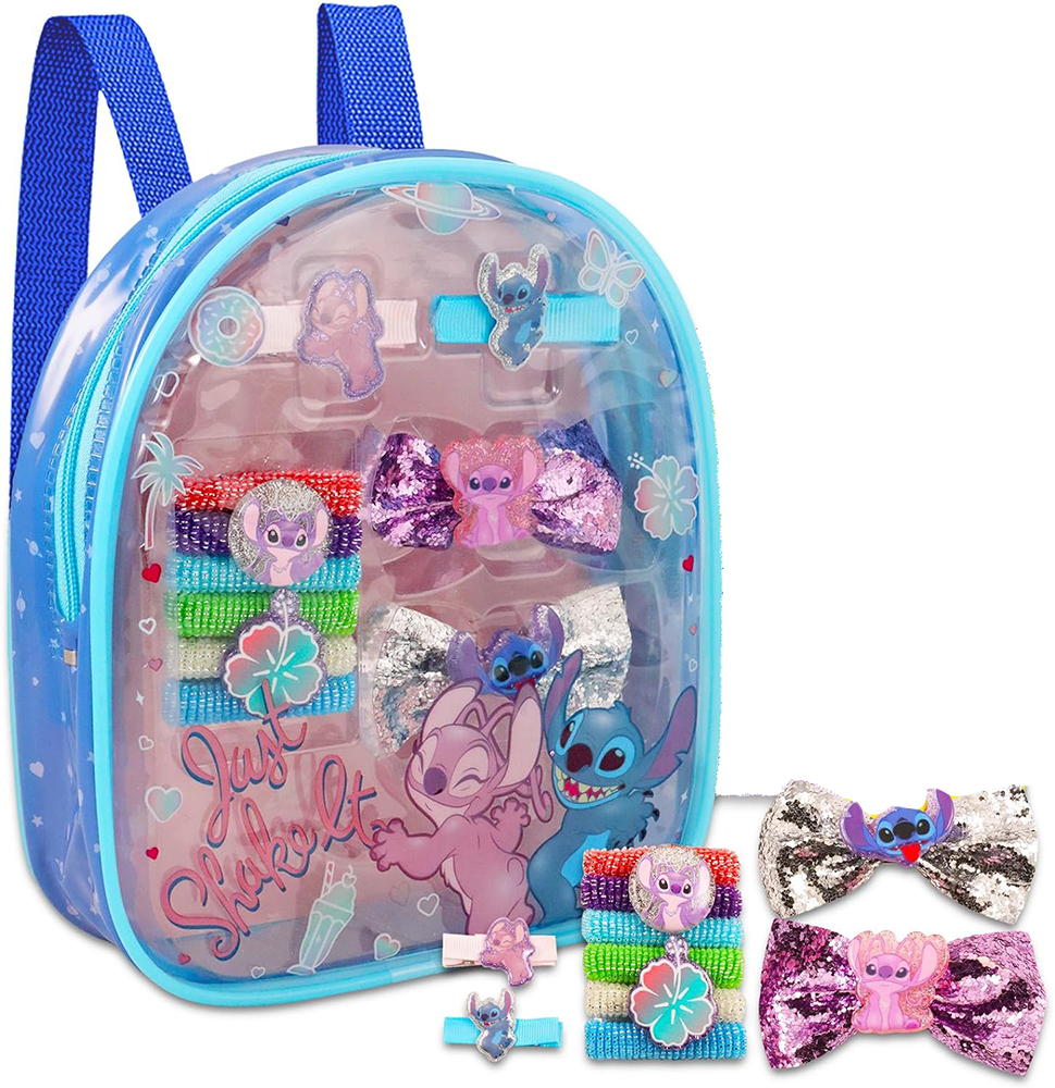 accessories kit includes 6 hair ties, 2 hair clips, 2 hair bows, all contained in one hair accessories bag featuring favorite Stitch and Angel.