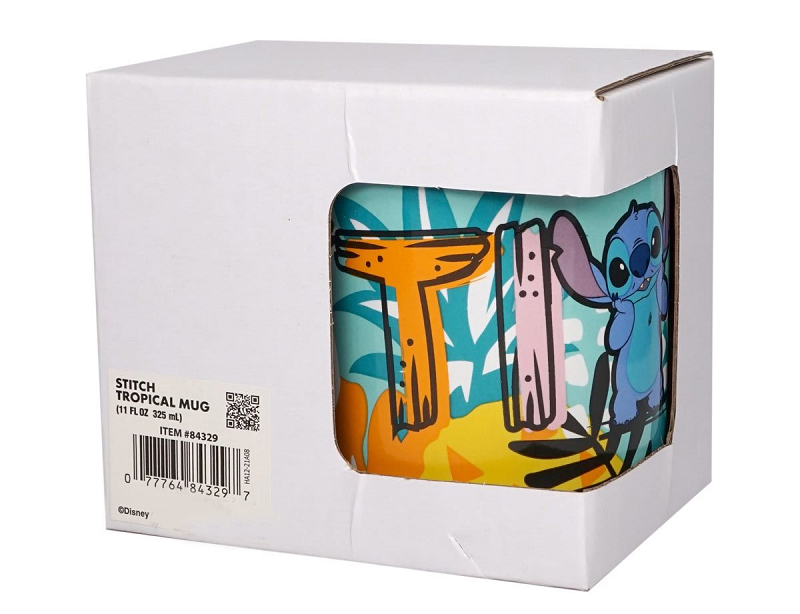 Enjoy your coffee or tea in style! This Lilo & Stitch Tropical 11 oz. Mug holds approximately 11 fluid ounces. Comes in box.