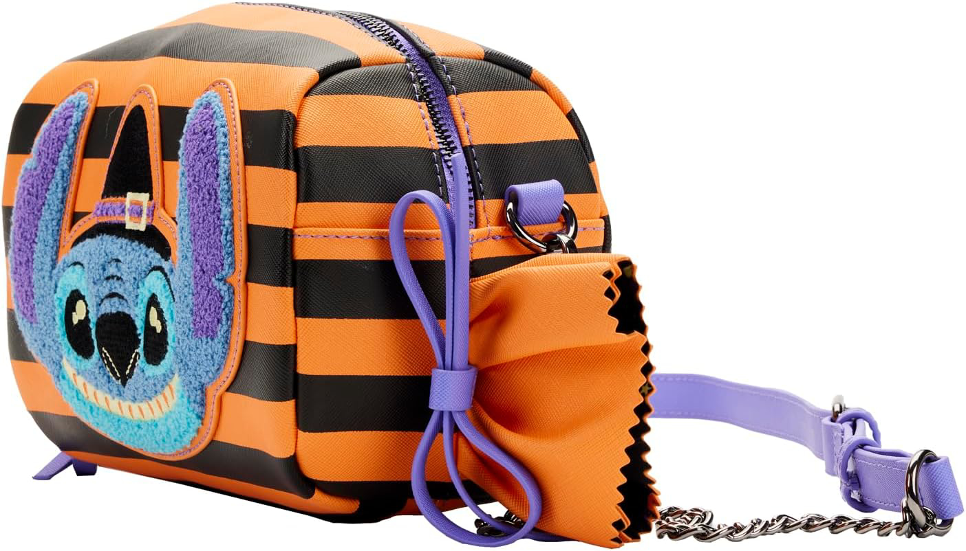 The Loungefly Lilo and Stitch Striped Halloween Candy Wrapper Crossbody Bag is made of vegan leather (polyurethane). Bag has adjustable (removeable) shoulder strap and sturdy metal hardware. Additional features include applique, ribbon, chenille, and printed details. Take note of the coordinating inside lining.