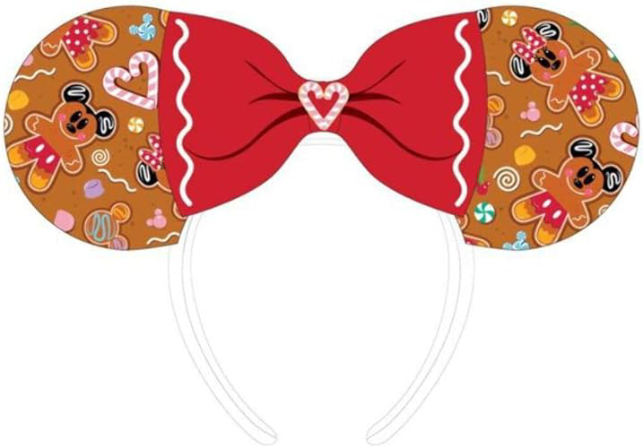 This delightful mini backpack design features Mickey and Minnie Mouse as gingerbread cookies along with Mickey ears shaped cookies, holly leaves, candy canes, and other assorted candies. The pattern on the Disney Ears headband matches the bag perfectly, and the center bow looks like it’s decorated with icing and a heart candy. The backpack even has front holder specifically for carrying your headband.
