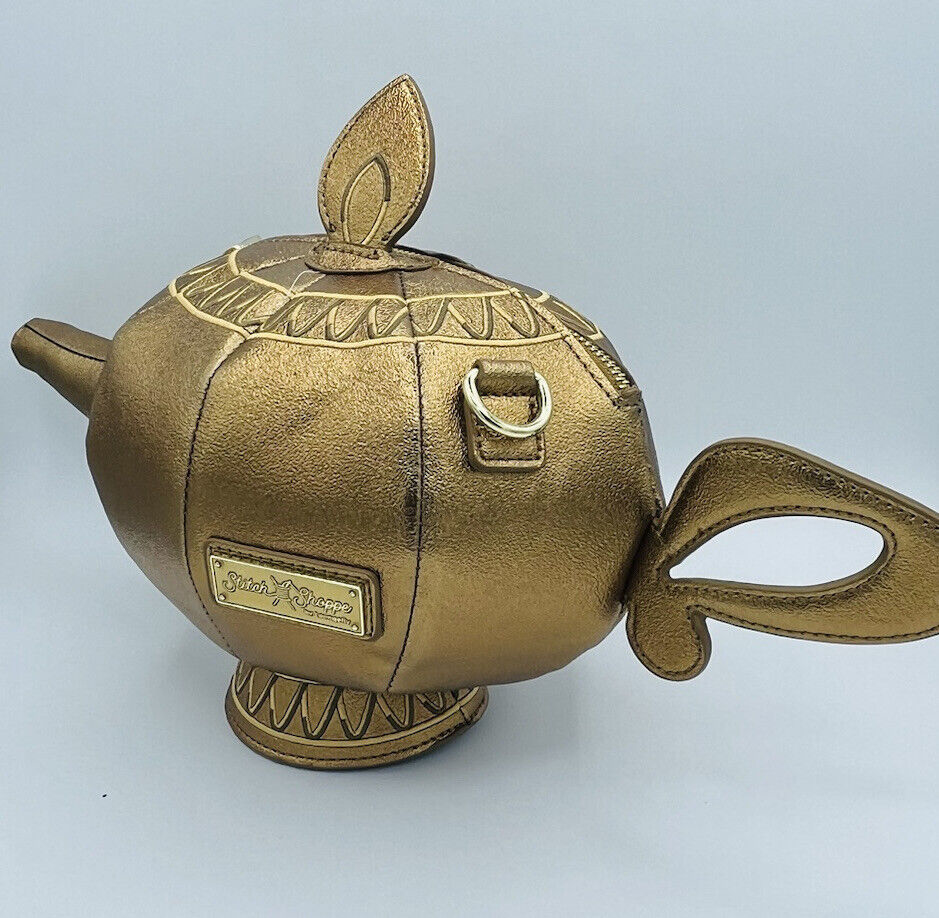 Expand your wish-list to include this gem of a crossbody bag. With this Disney Aladdin 30th Anniversary Genie Lamp Crossbody Bag, wishes for stylish and magical ways to secure and store your possessions are at your command! The entire body of this crossbody bag is shaped like Genie’s magical lamp. Embroidered details grace the top and bottom of the decorative elements on this bag, and a vegan leather (polyurethane) charm of Genie, as a bee, completes the look. This crossbody bag also features a shiny gold chain shoulder strap that’s adjustable and removable. It’s the perfect accessory to complement a Disney outfit or transform any outing into a magical adventure. Crossbody bag features include shiny gold hardware, vegan leather (polyurethane), adjustable and removable straps, a vegan leather charm, and embroidered details. Note the coordinating lining.