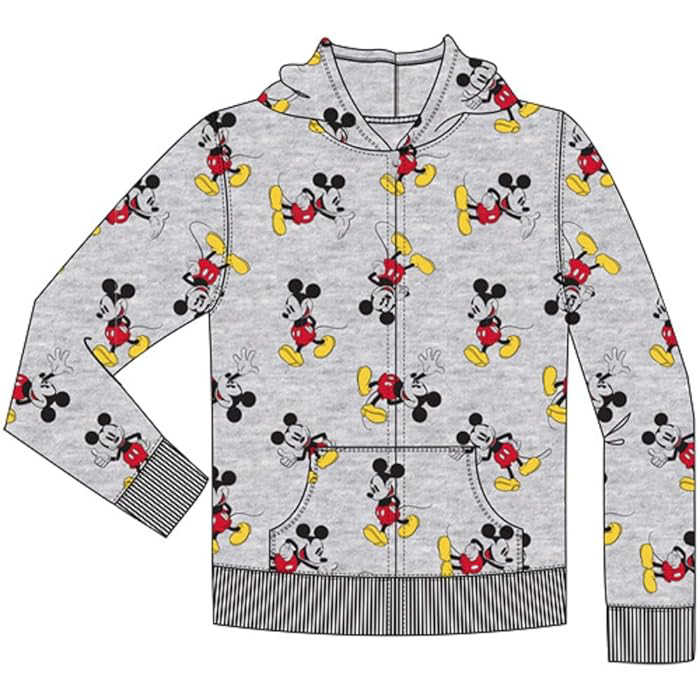 Women's Disney Mickey Mouse Zip Hoodie All-Over Print Sweatshirt Heather Gray. Featuring an all-over print of Mickey Mouse in various poses. Unisex sizing - Girls and Boys. Size S3/5