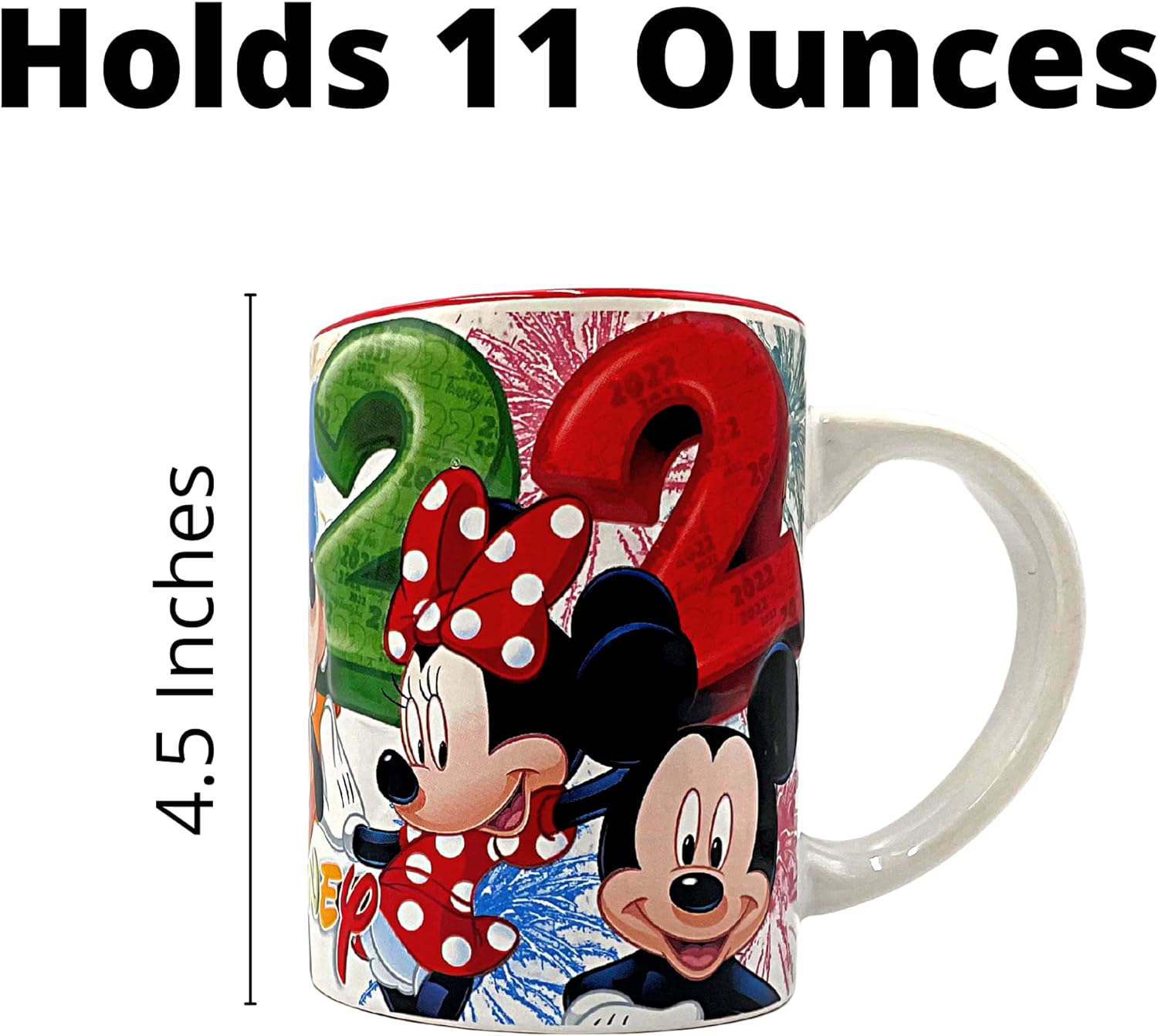 FEATURES Pictured on this mug is Mickey Mouse and his friends Minnie, Goofy, Pluto, and Donald. This mug is black and features 2022 across the front.
